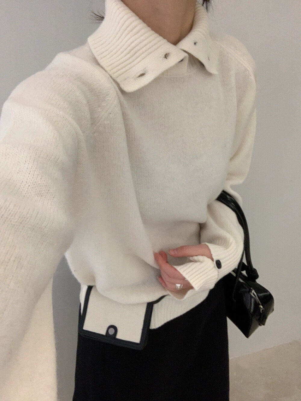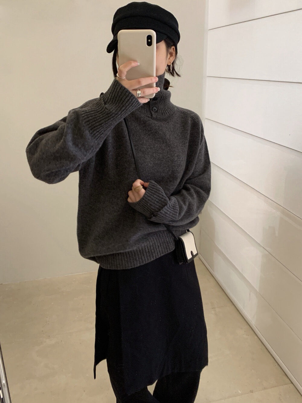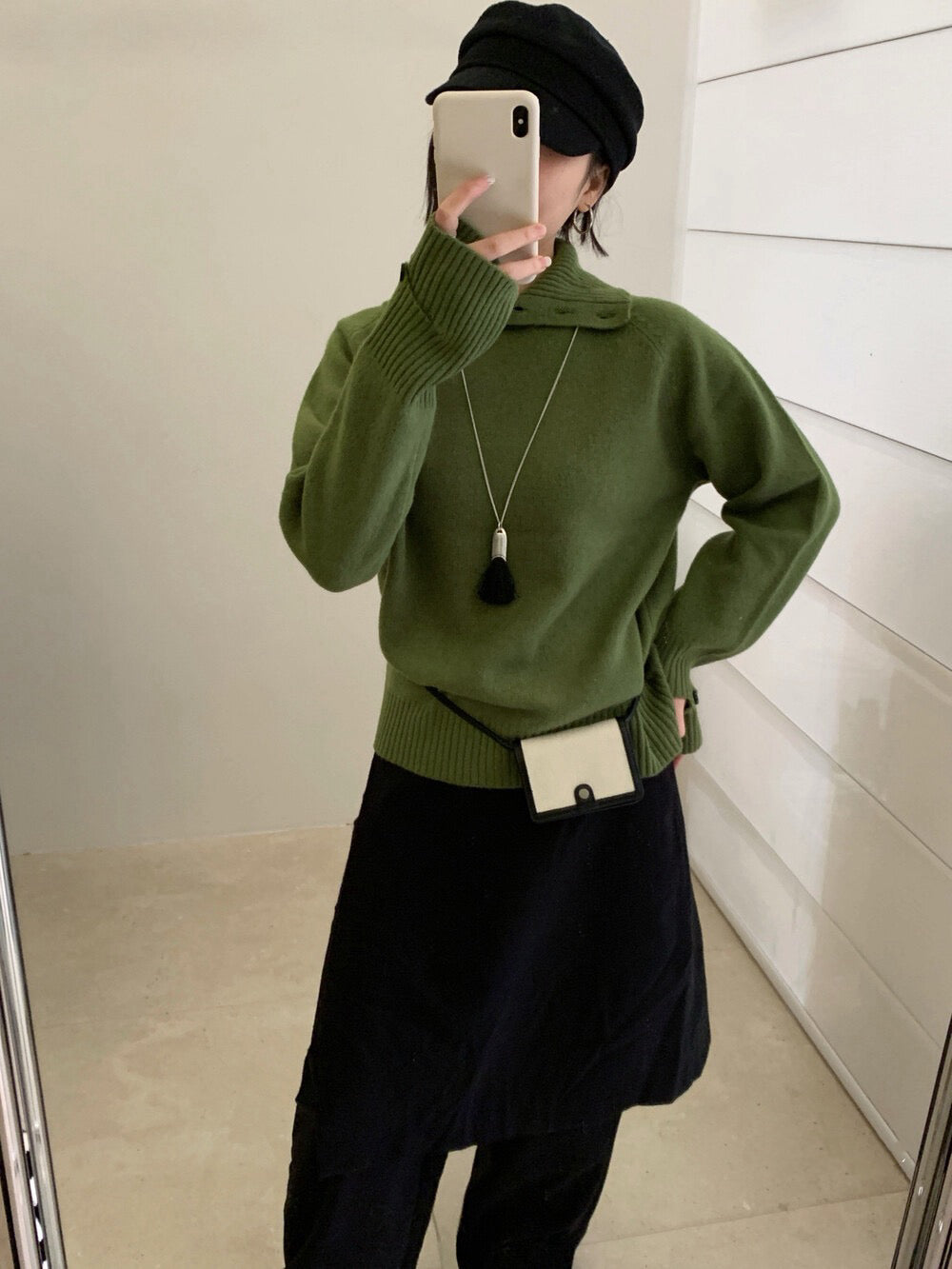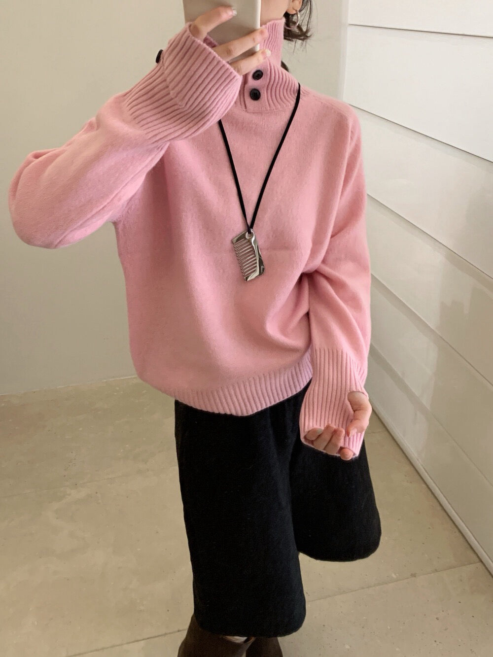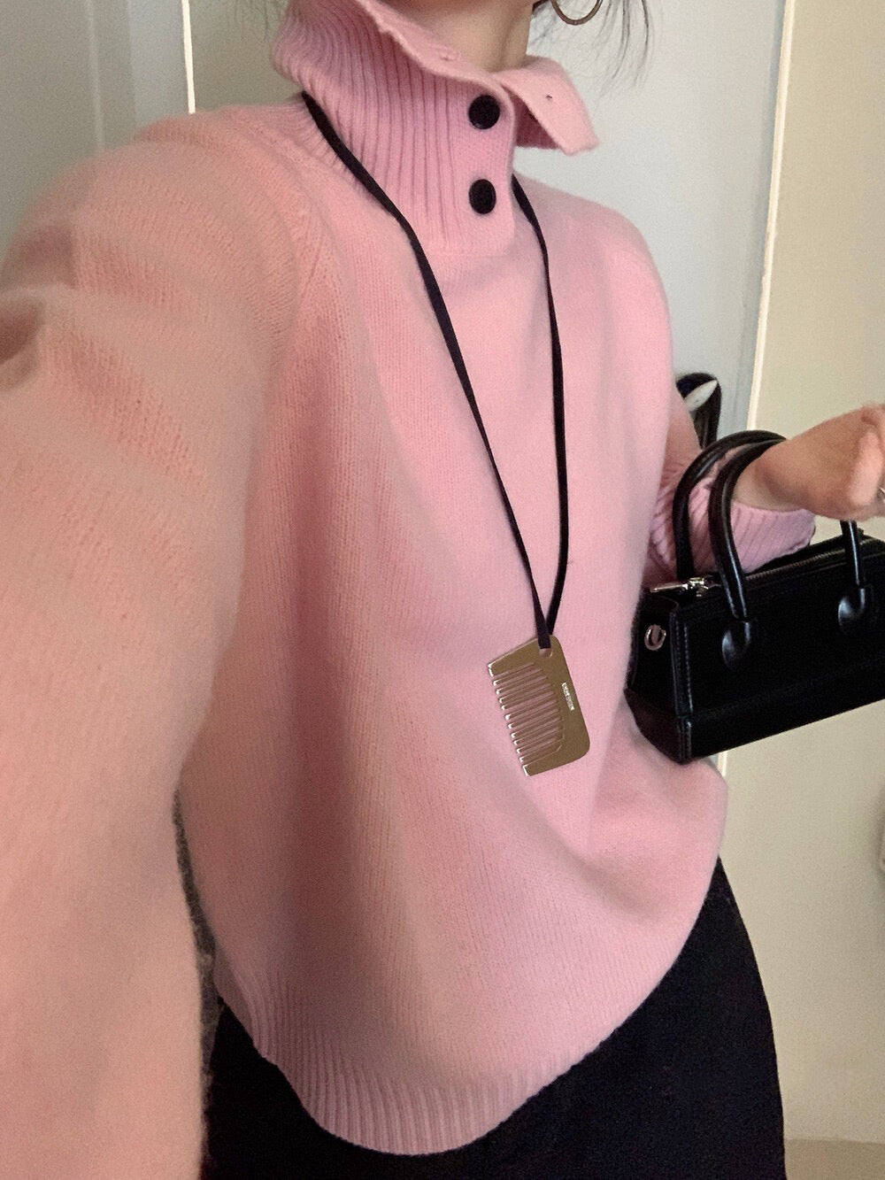 // 100%綿羊毛鈕扣可立領+設計感袖口毛衣