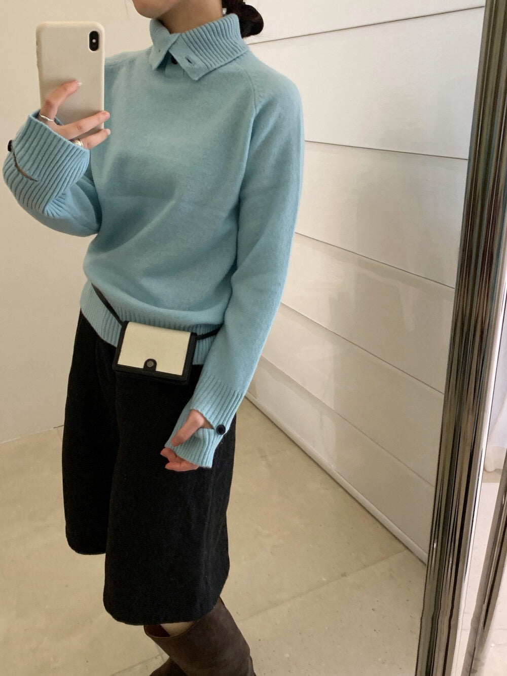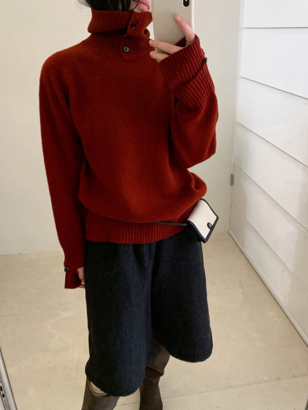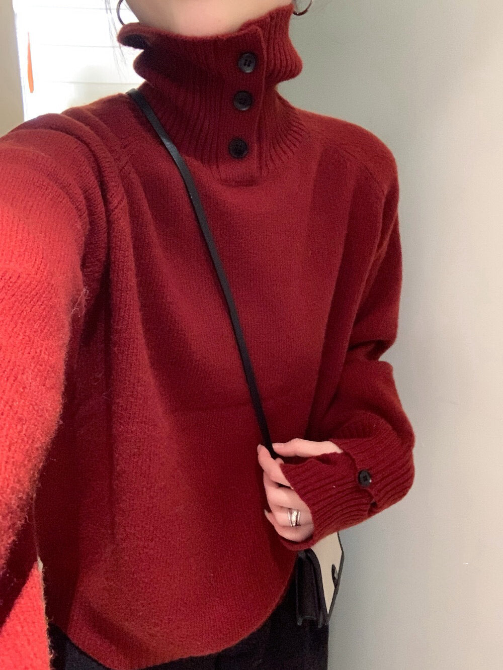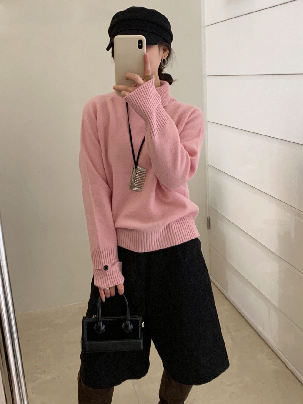 // 100%綿羊毛鈕扣可立領+設計感袖口毛衣
