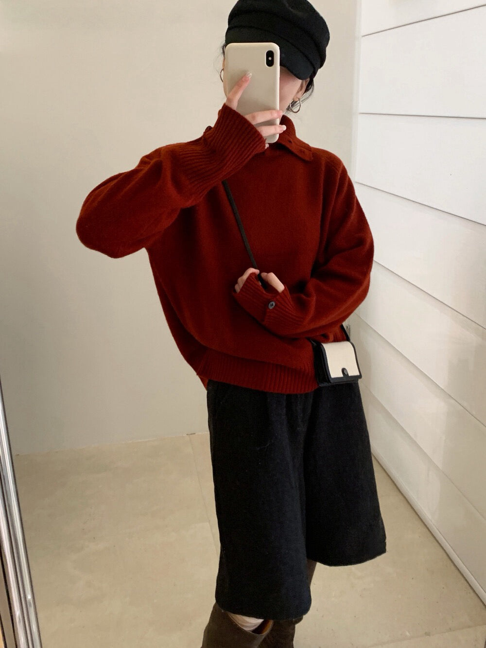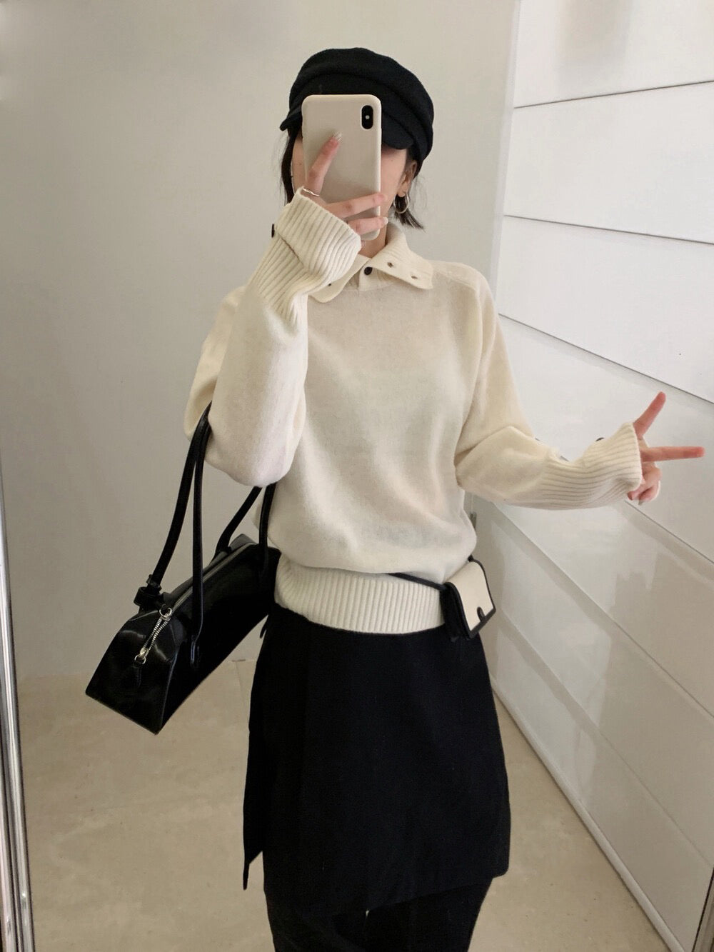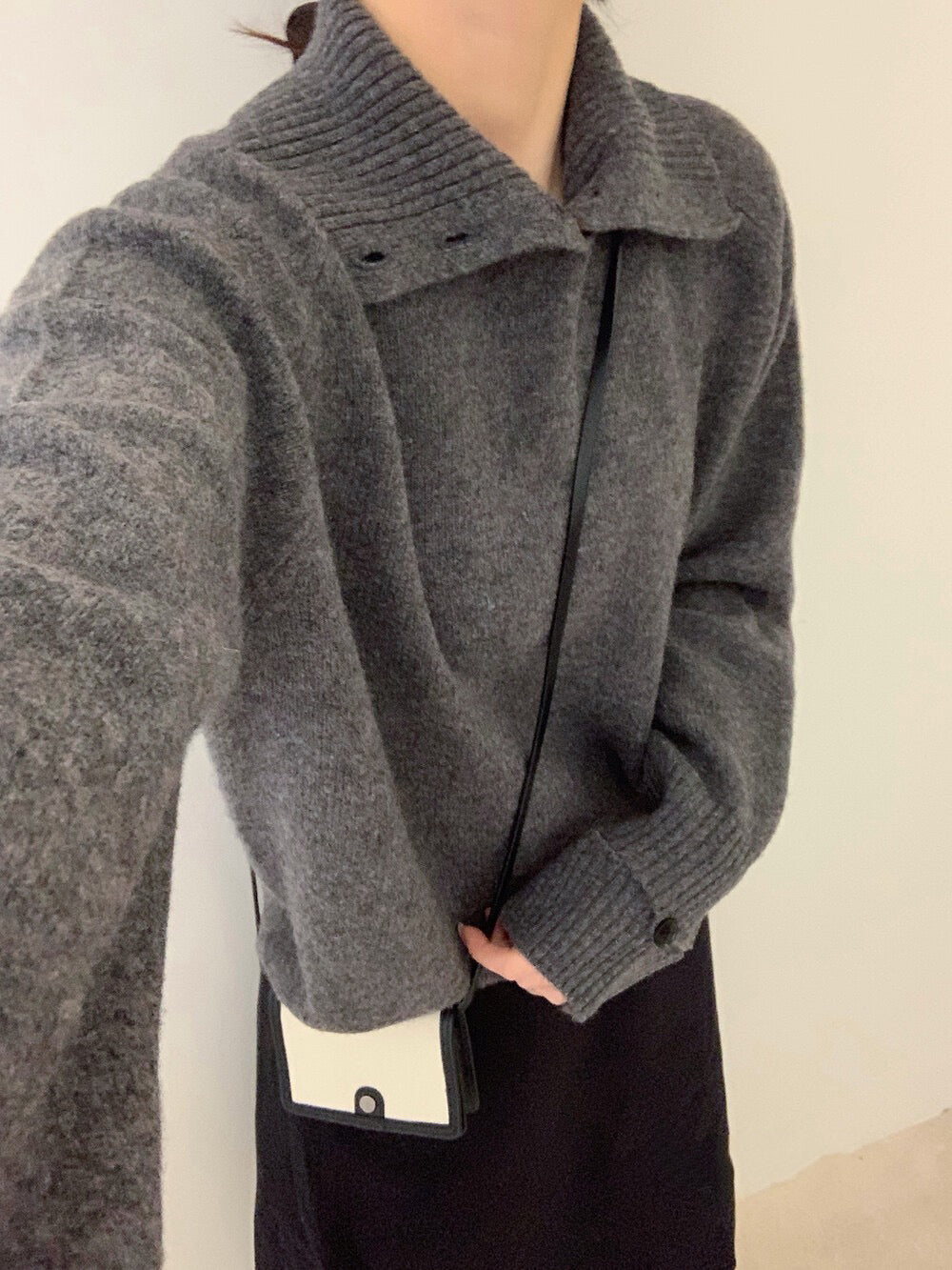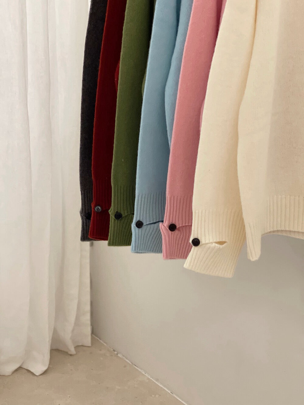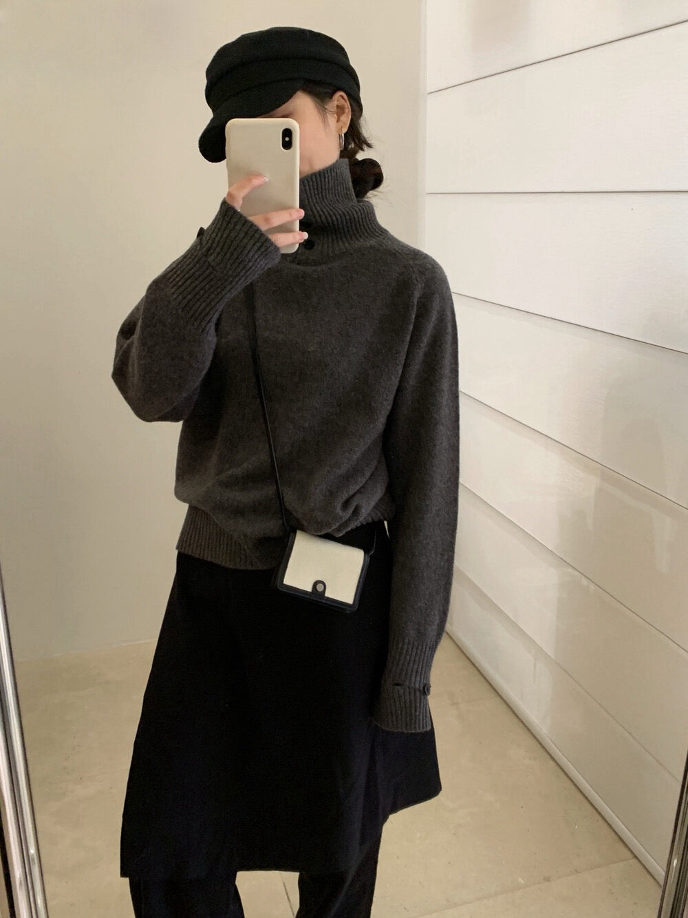 // 100%綿羊毛鈕扣可立領+設計感袖口毛衣