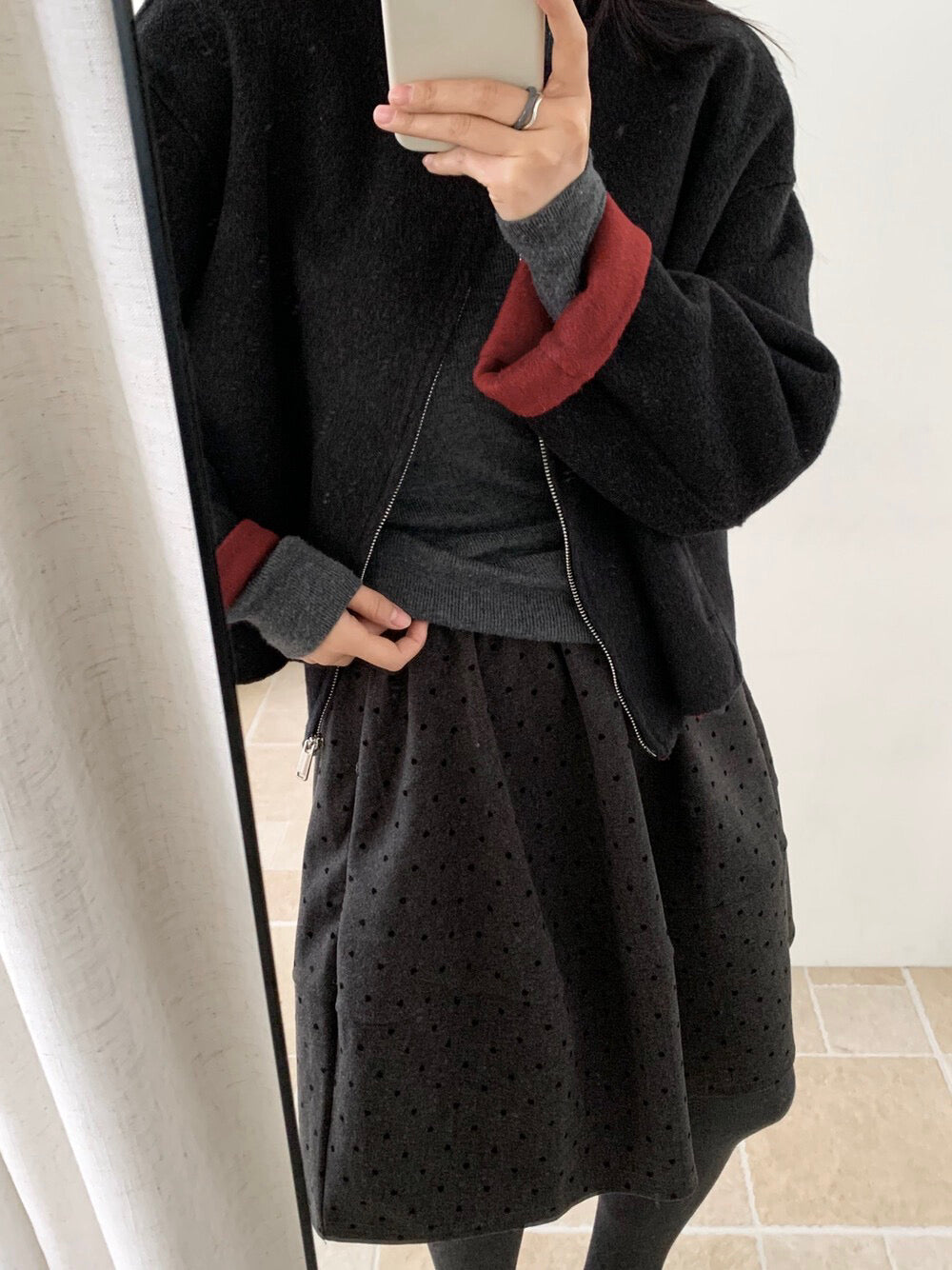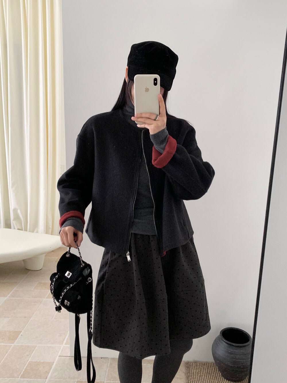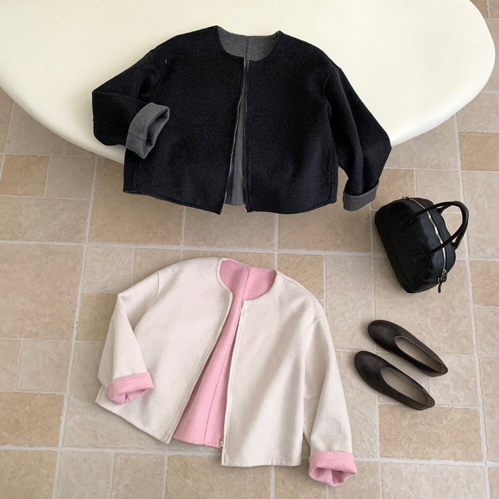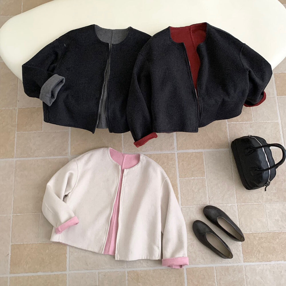 // 100%羊毛內撞色簡約圓領拉鍊手工外套