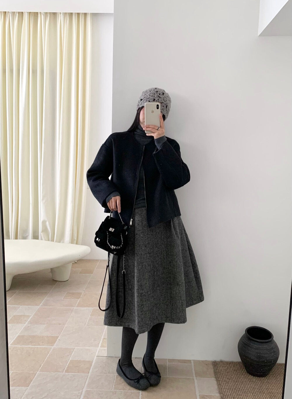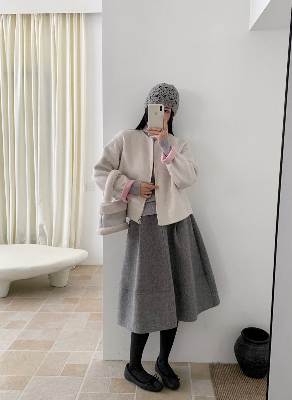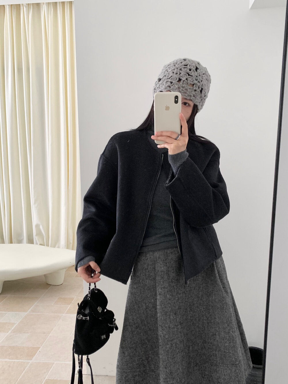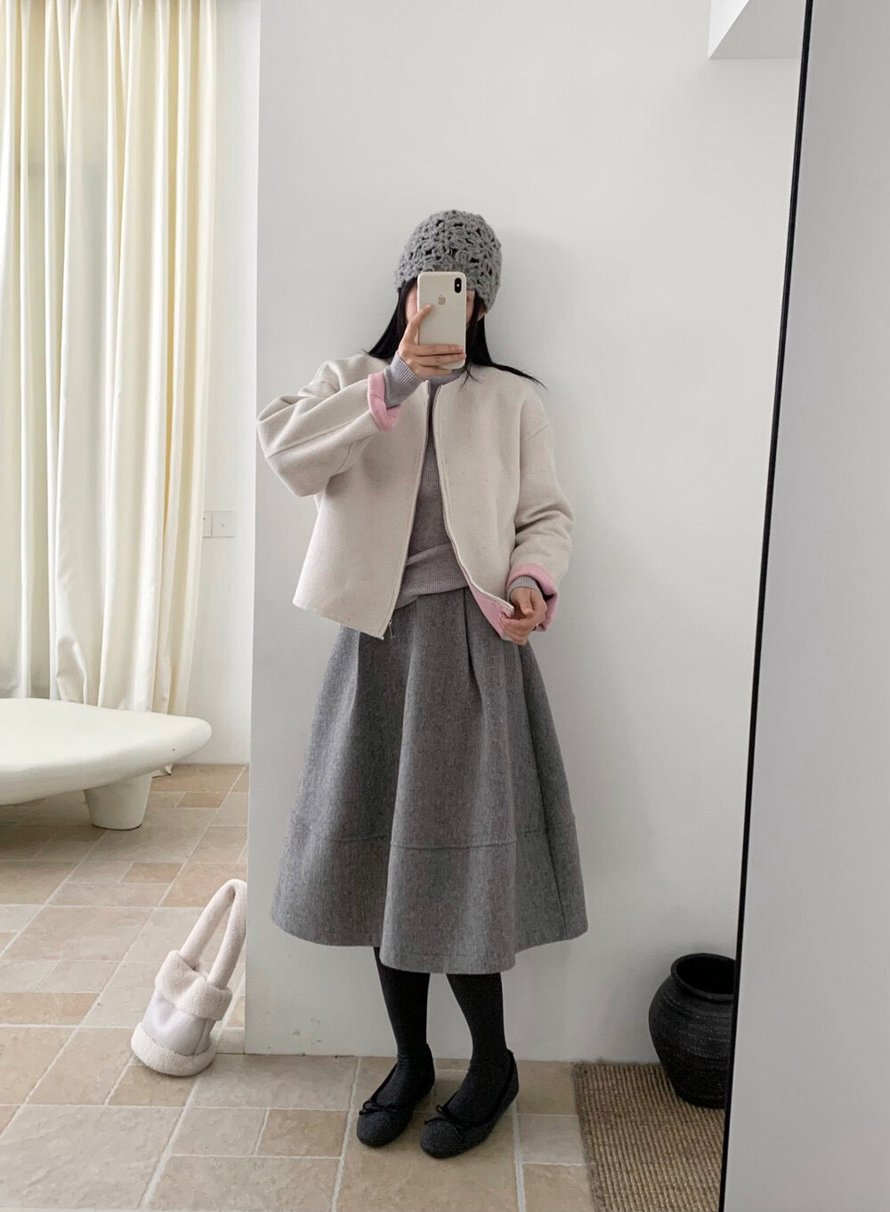 // 100%羊毛內撞色簡約圓領拉鍊手工外套