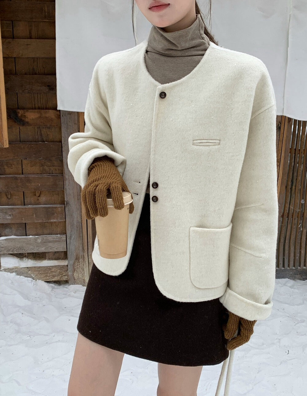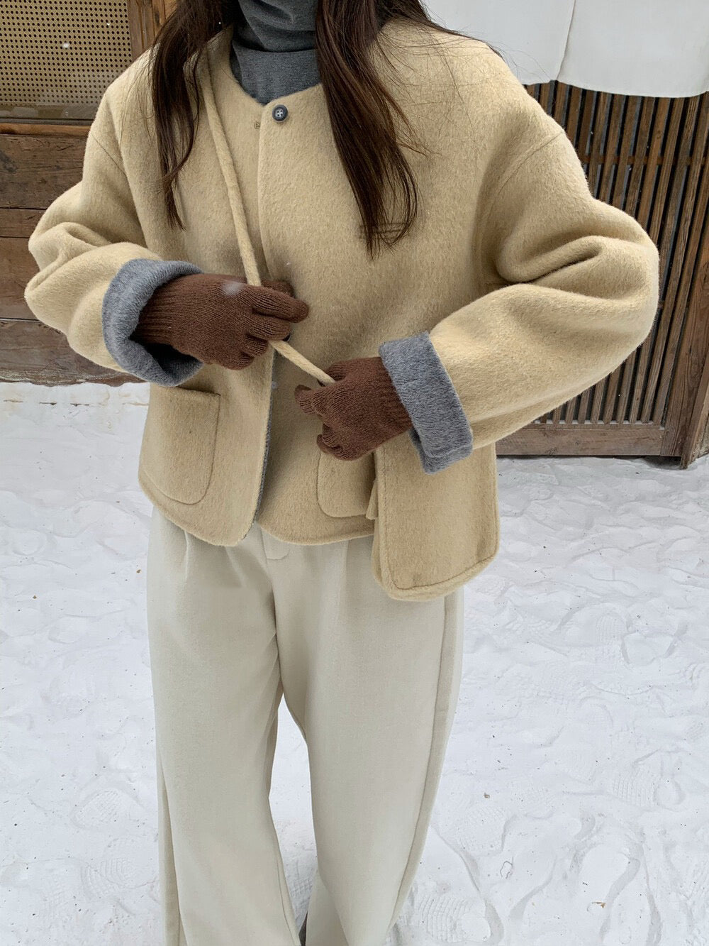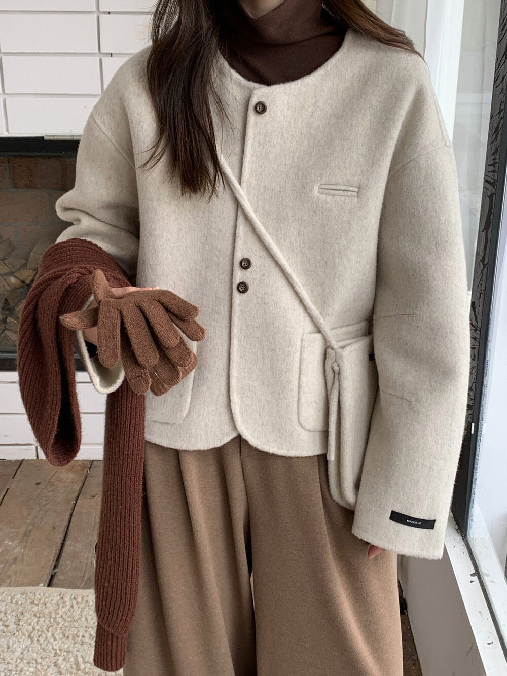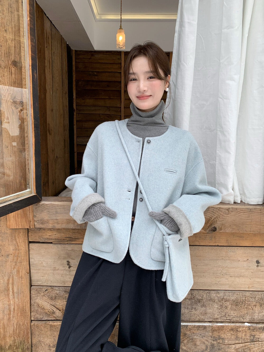 // 100%羊毛弧邊口袋特別鈕扣手工外套(連袋仔)