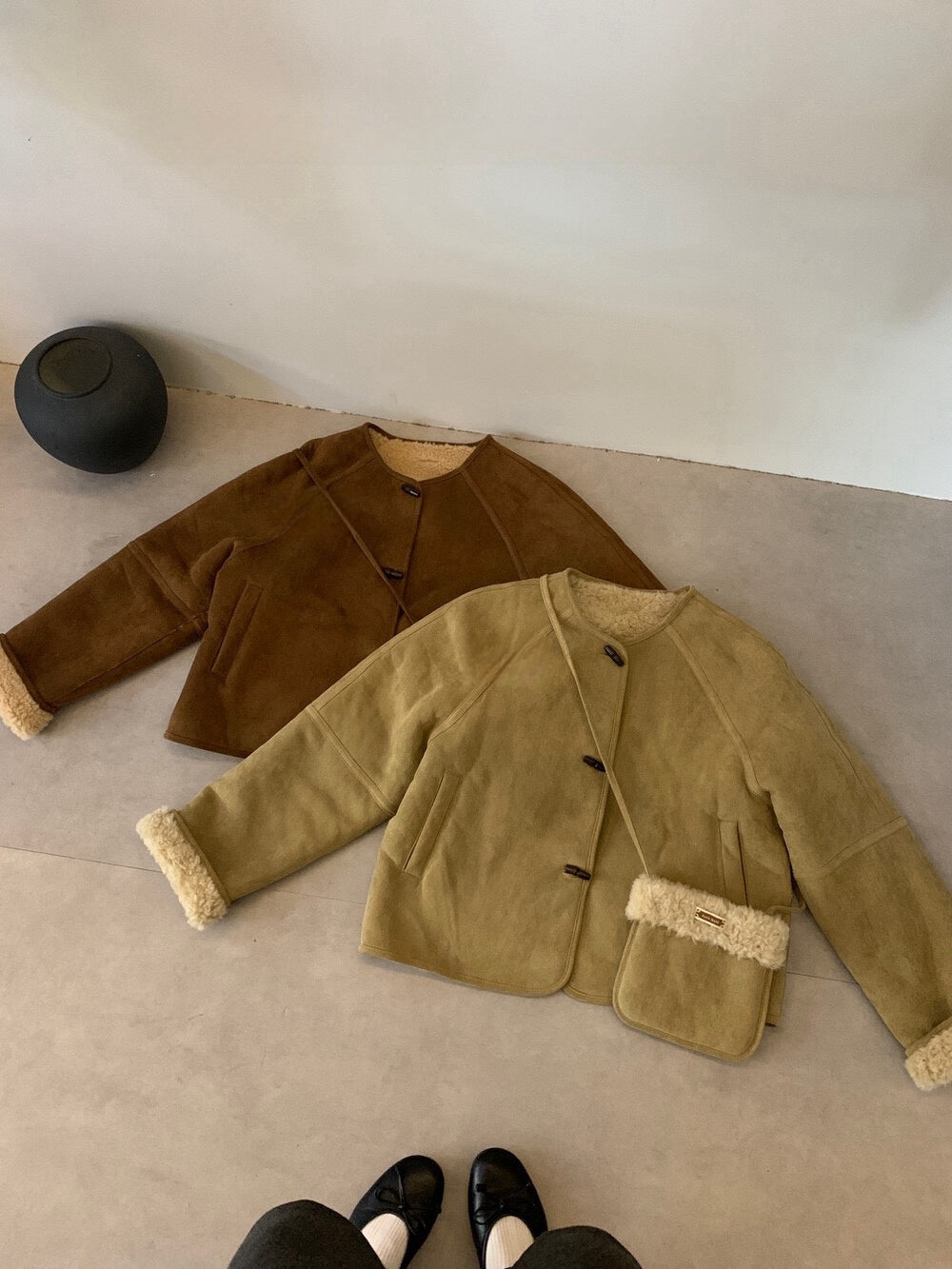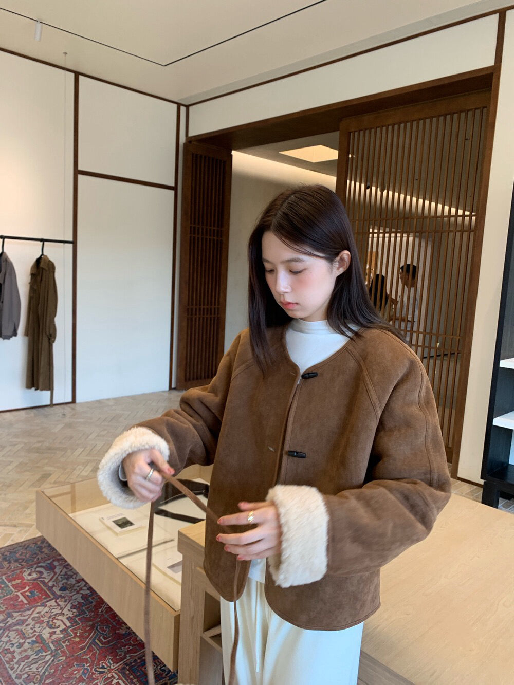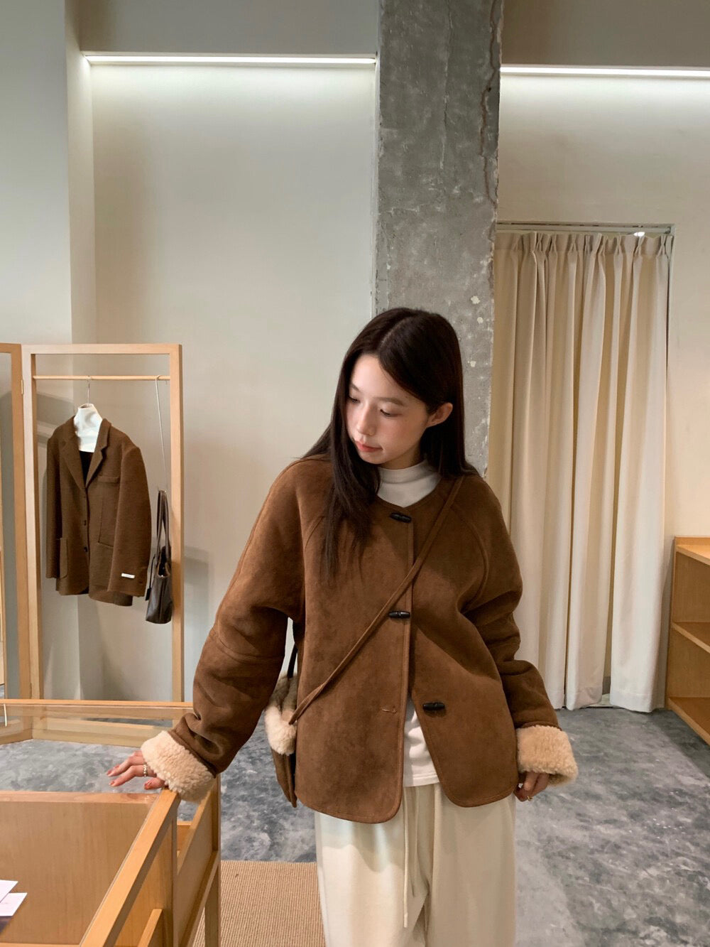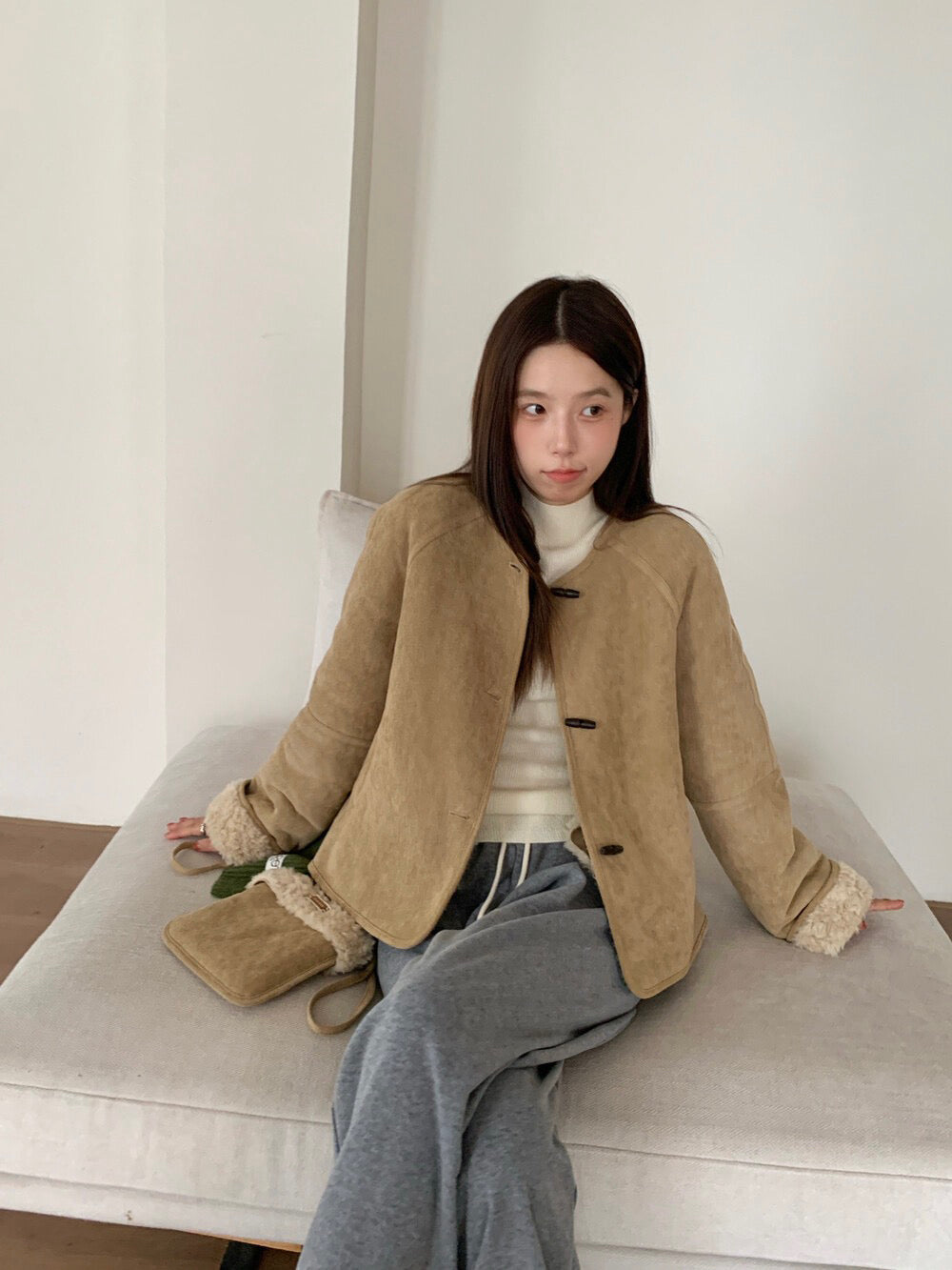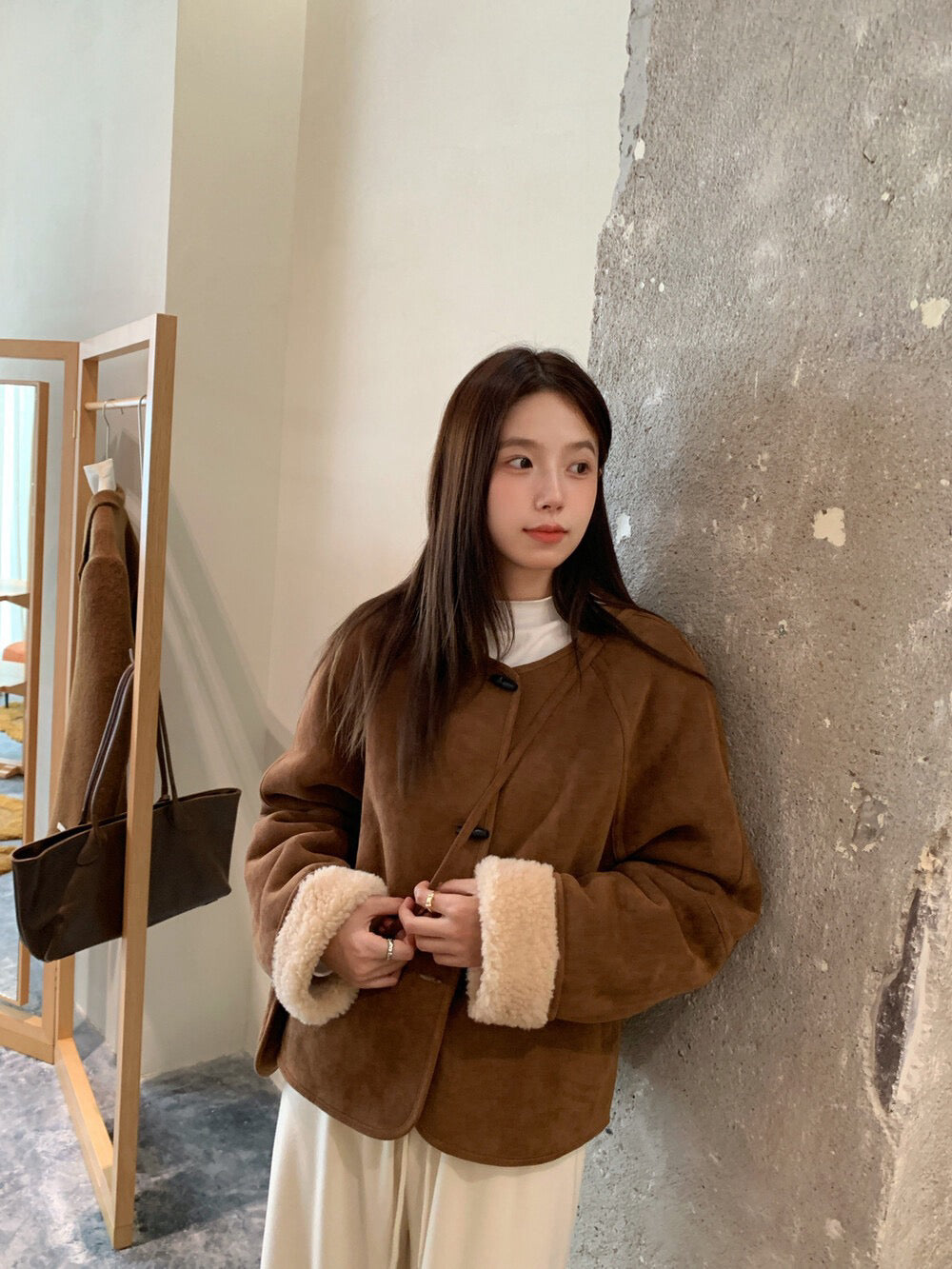 // 100%羊毛皮毛一體牛角鈕外套(連袋仔)
