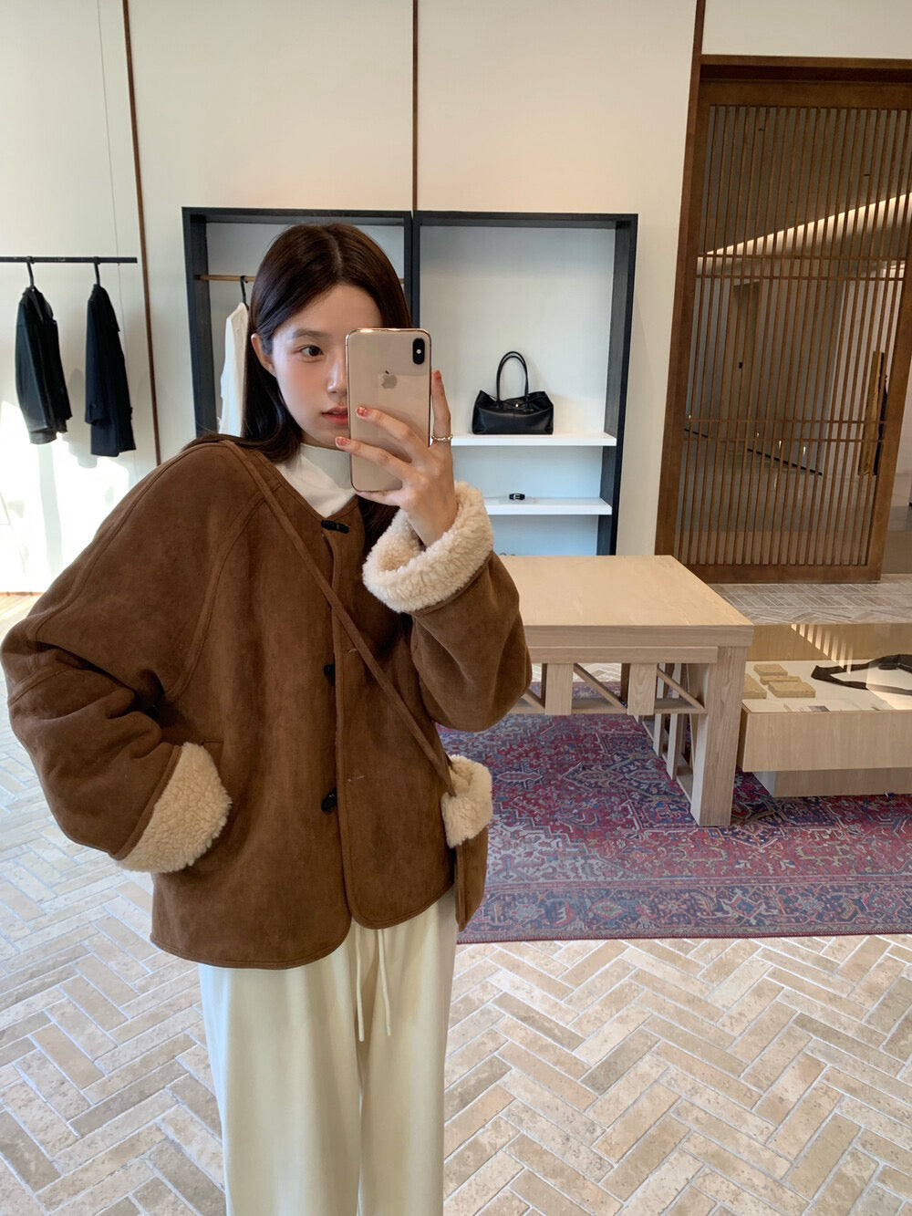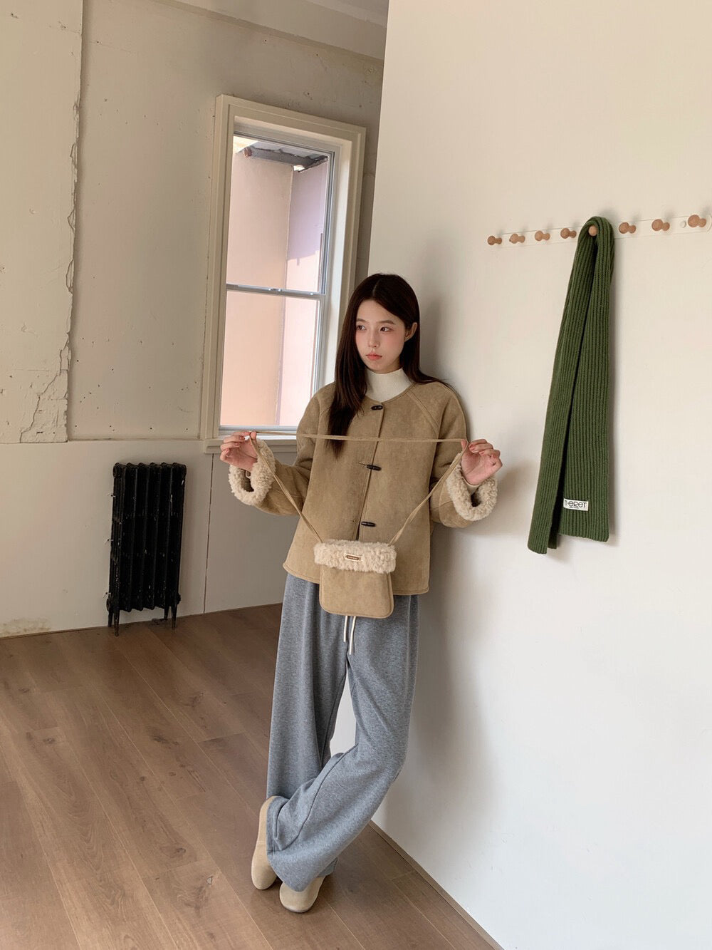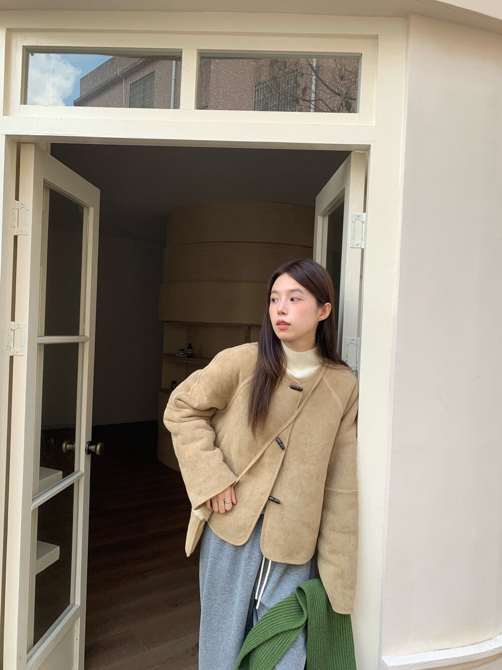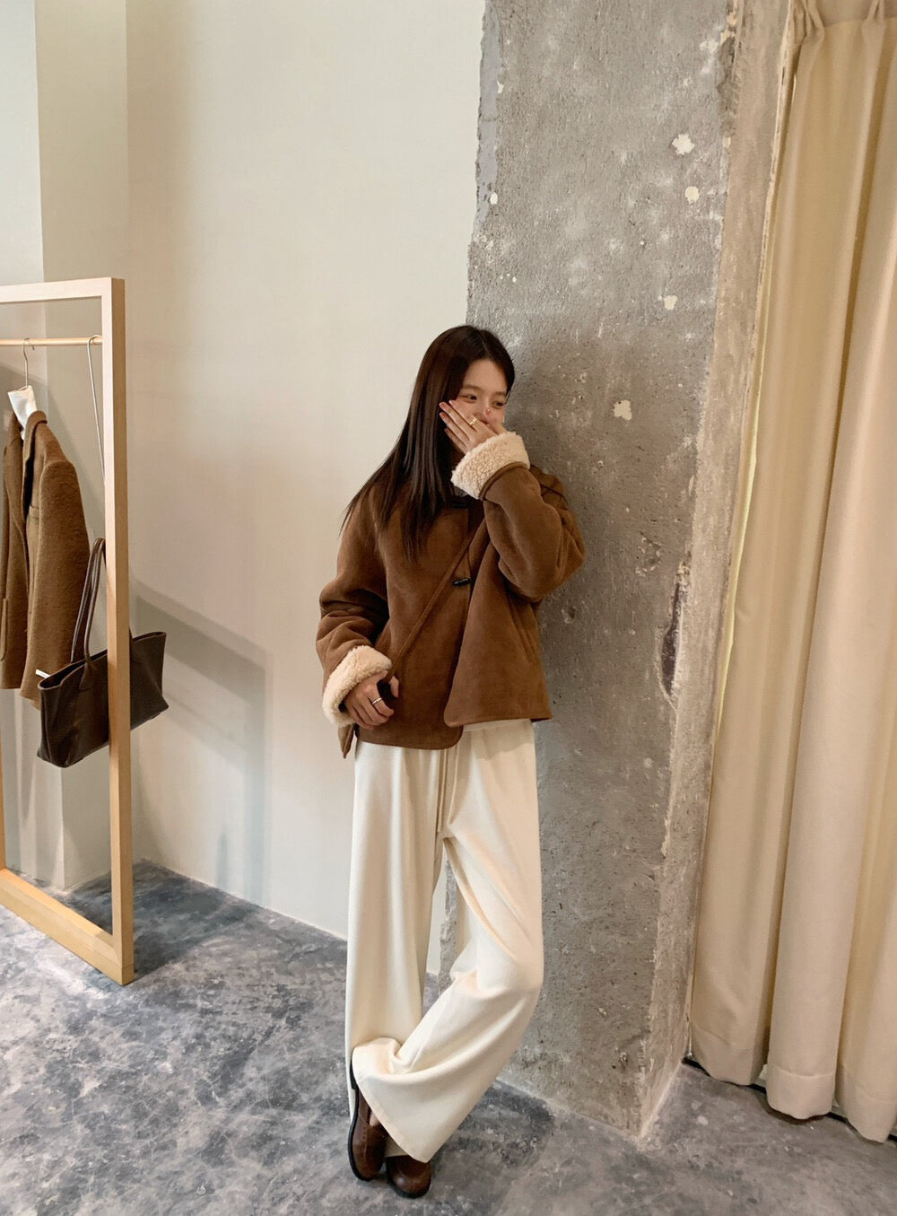 // 100%羊毛皮毛一體牛角鈕外套(連袋仔)