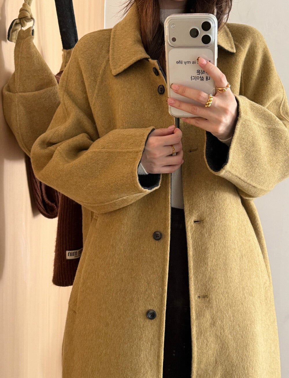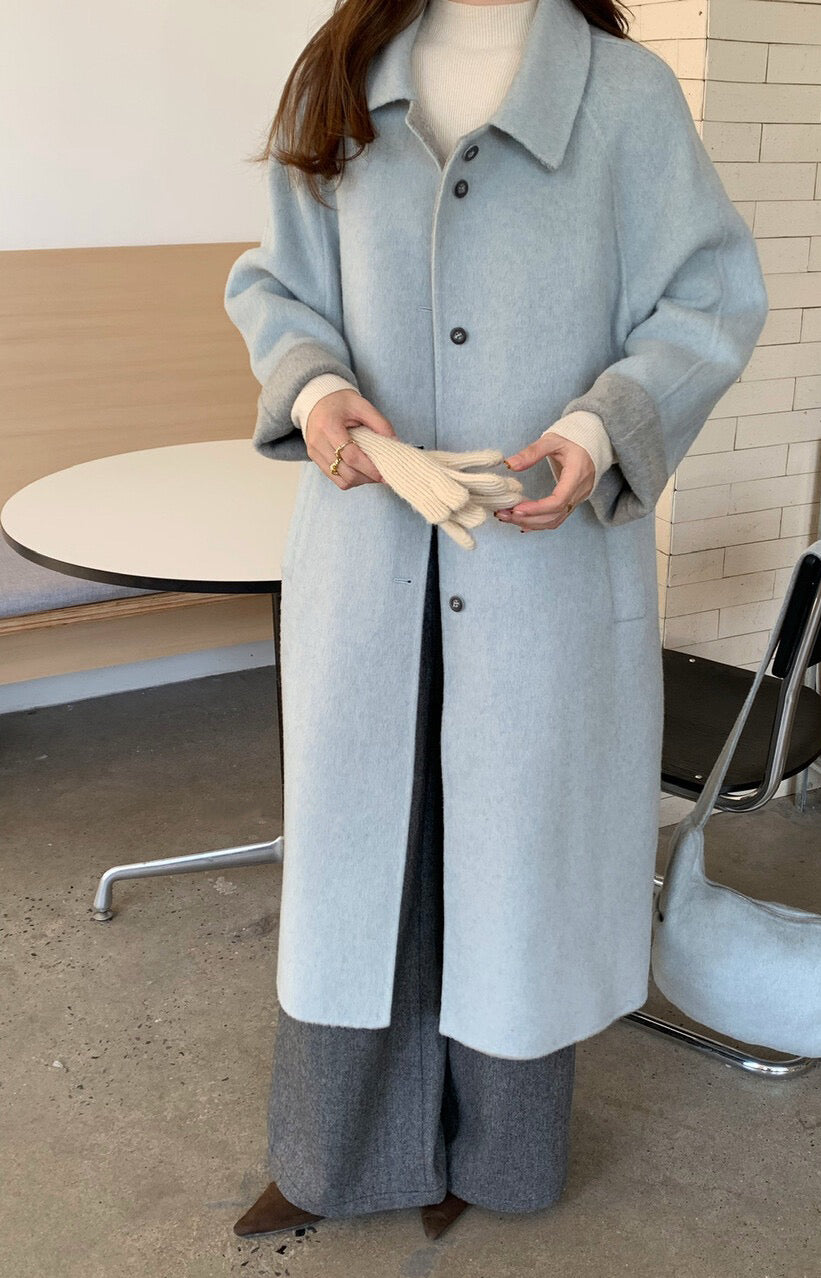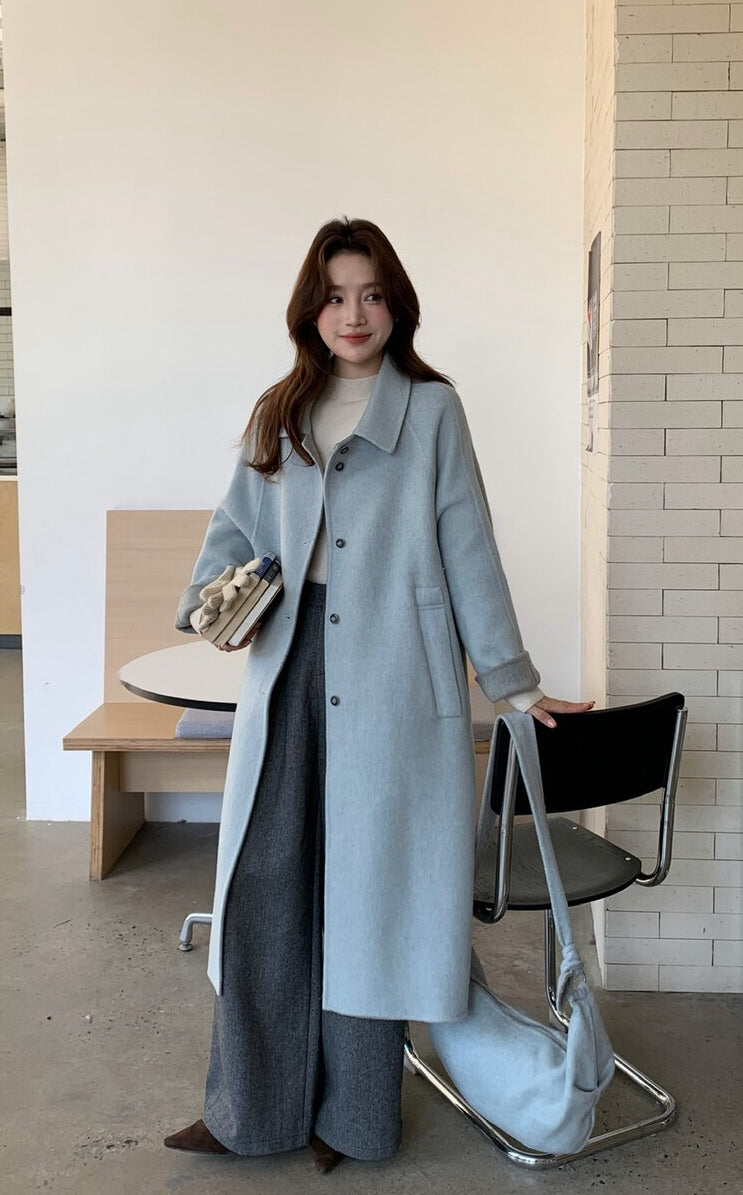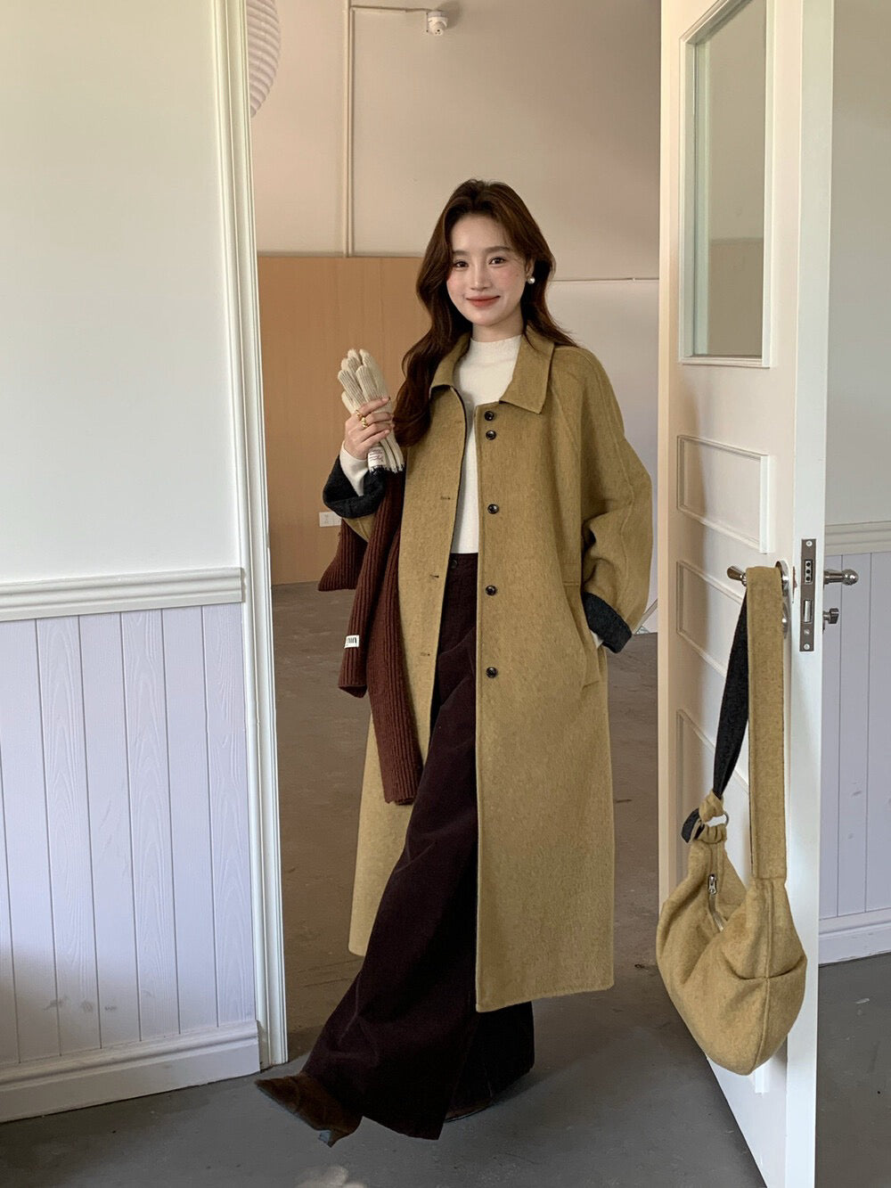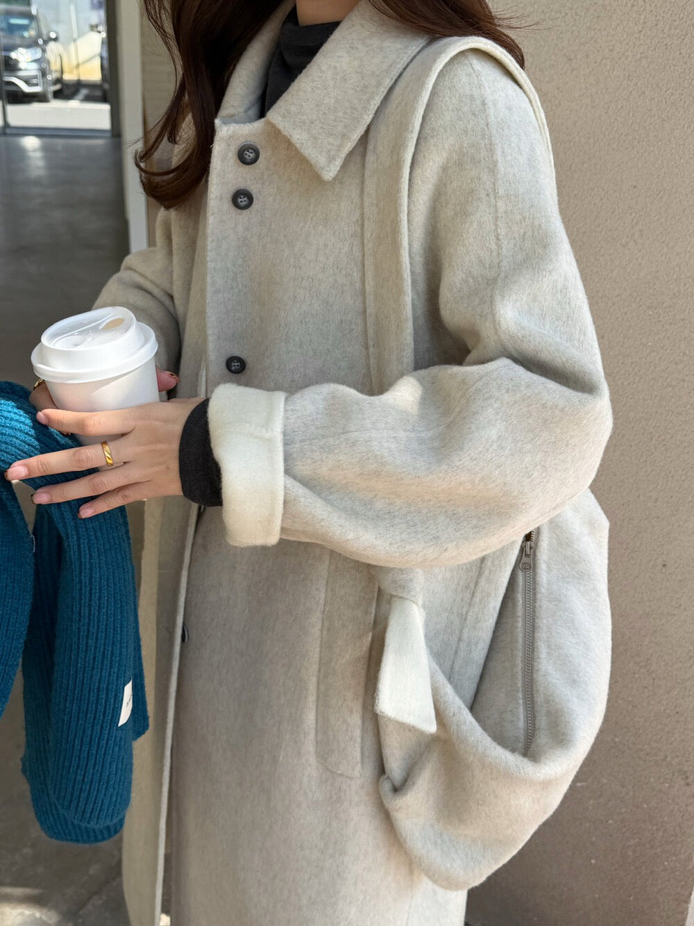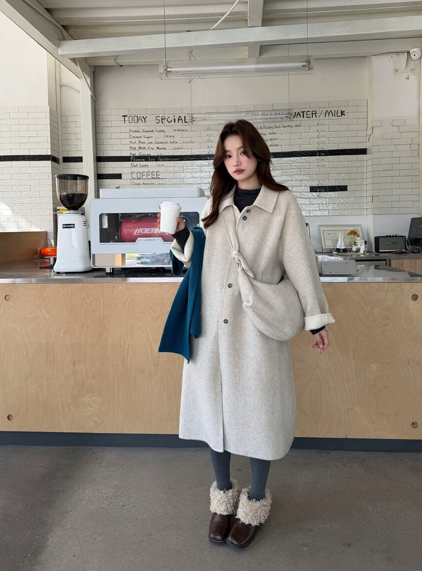 // 100%羊毛簡約翻領長款手工外套(連斜背包)
