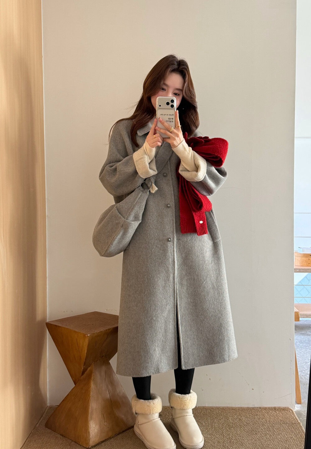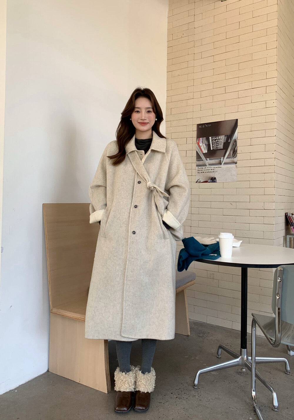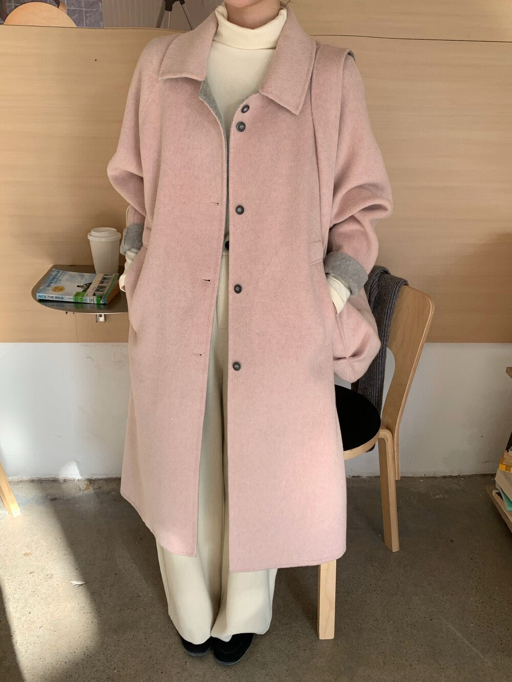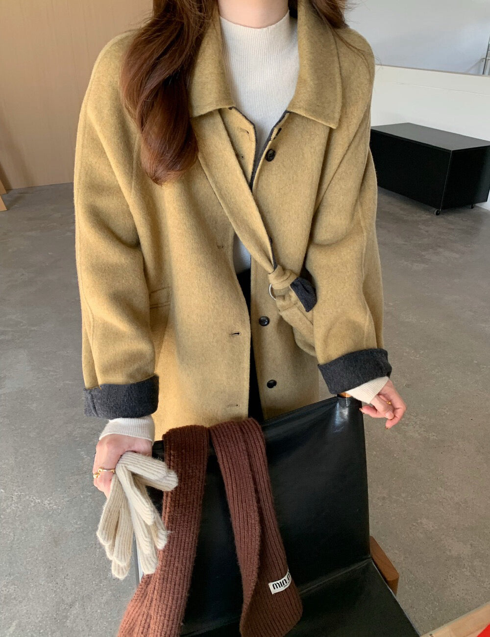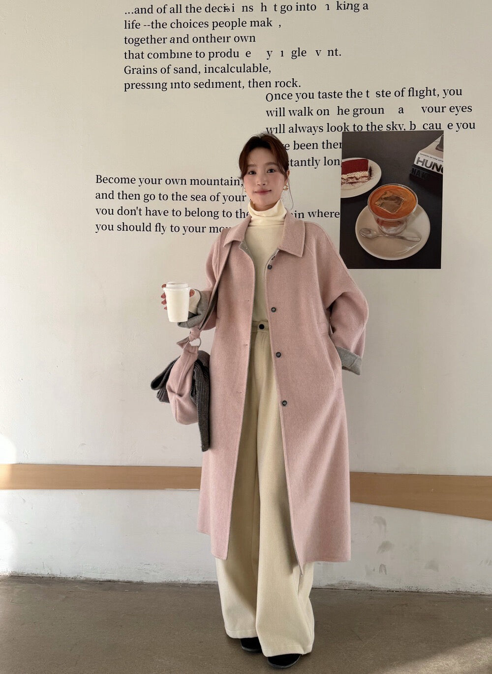 // 100%羊毛簡約翻領長款手工外套(連斜背包)