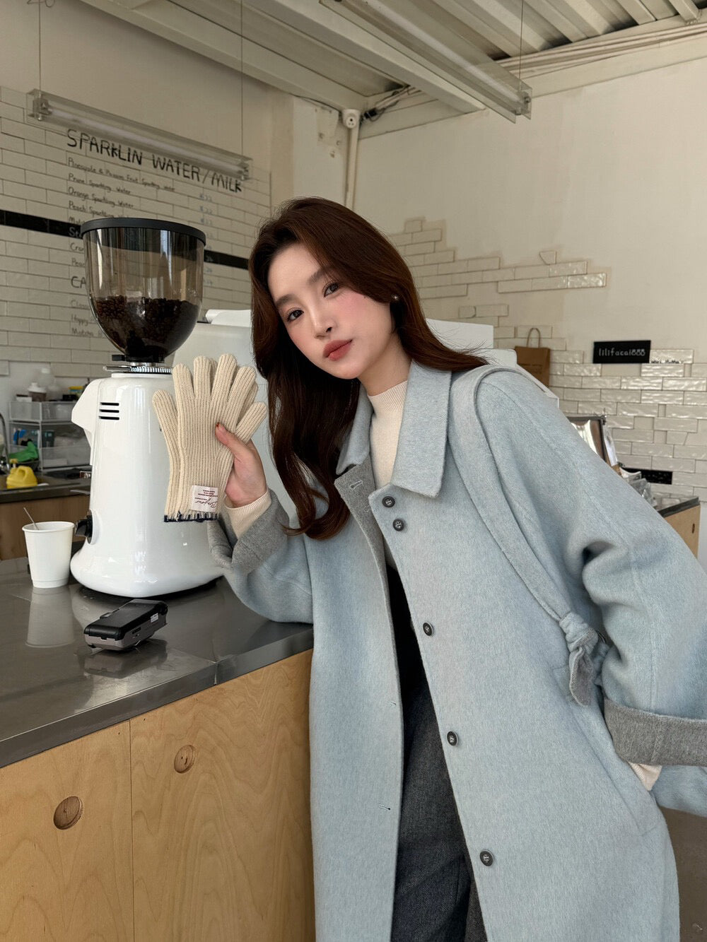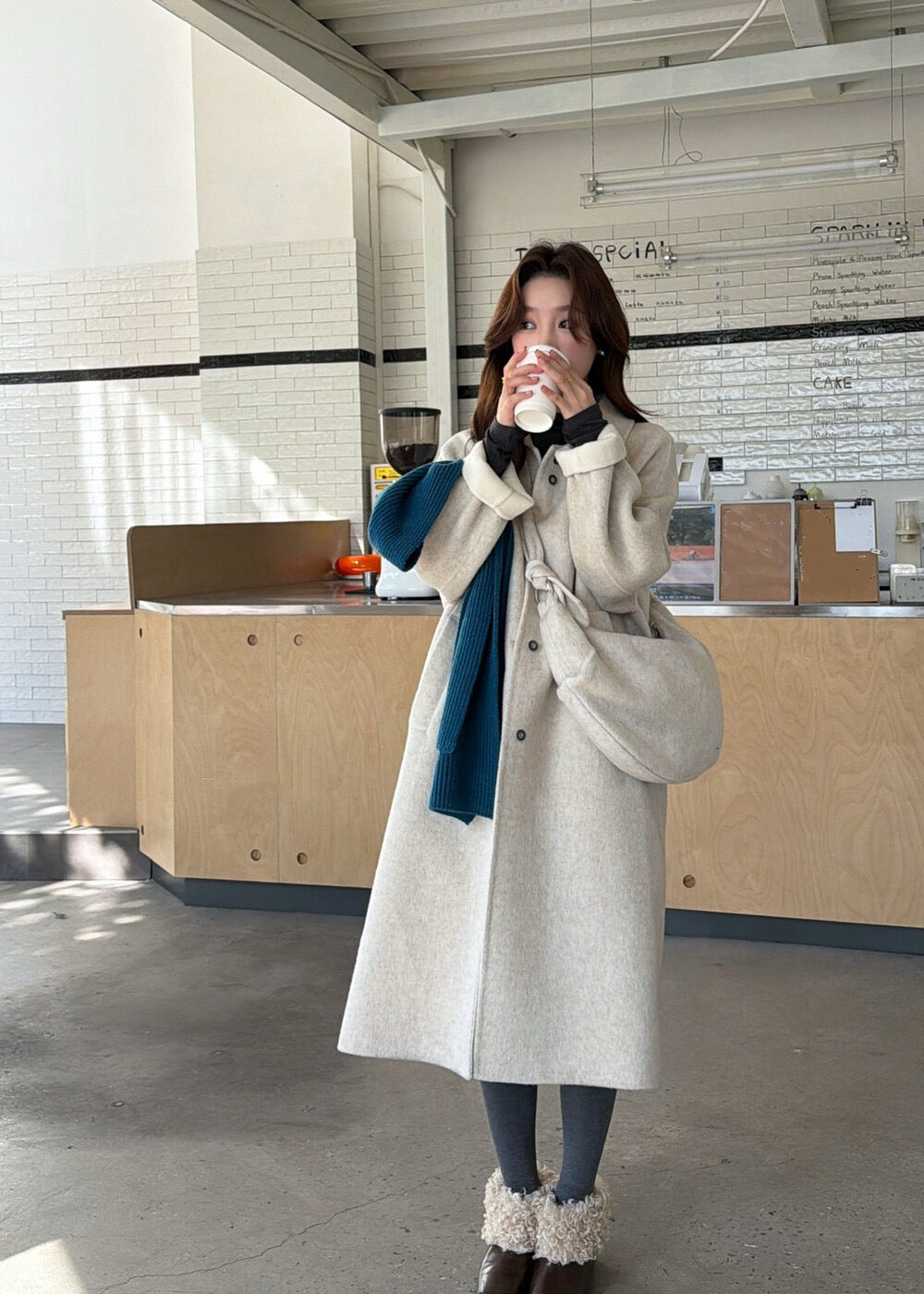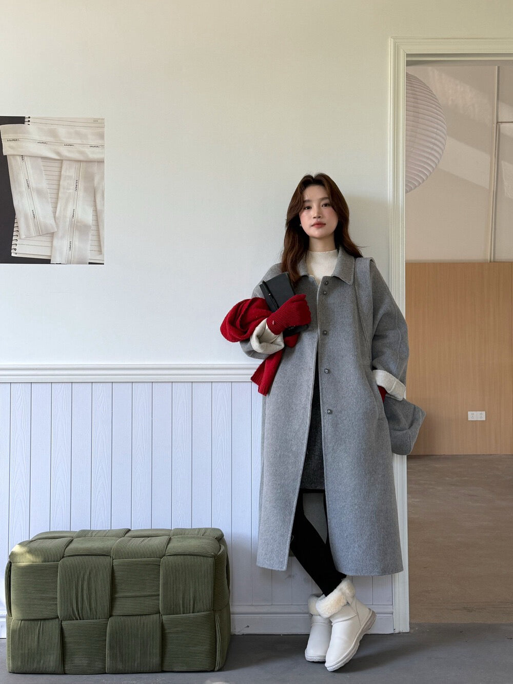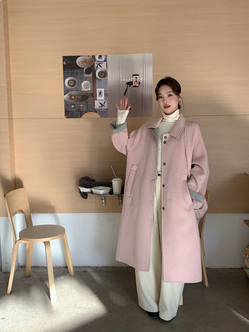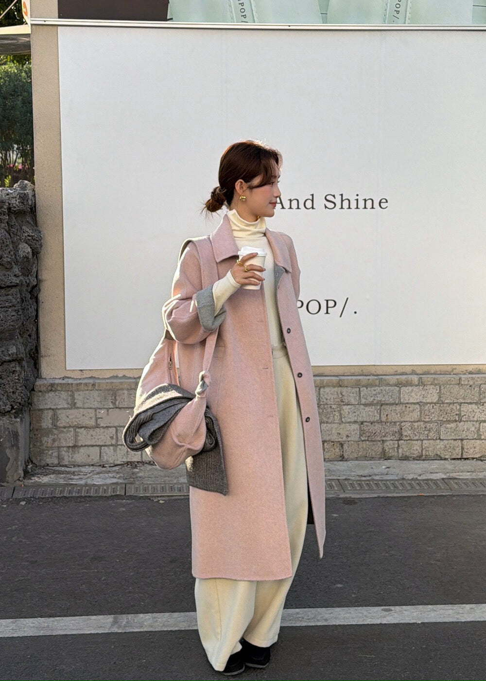 // 100%羊毛簡約翻領長款手工外套(連斜背包)