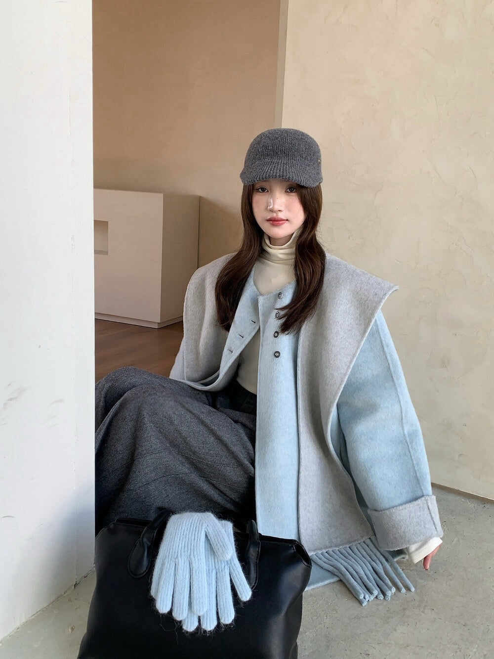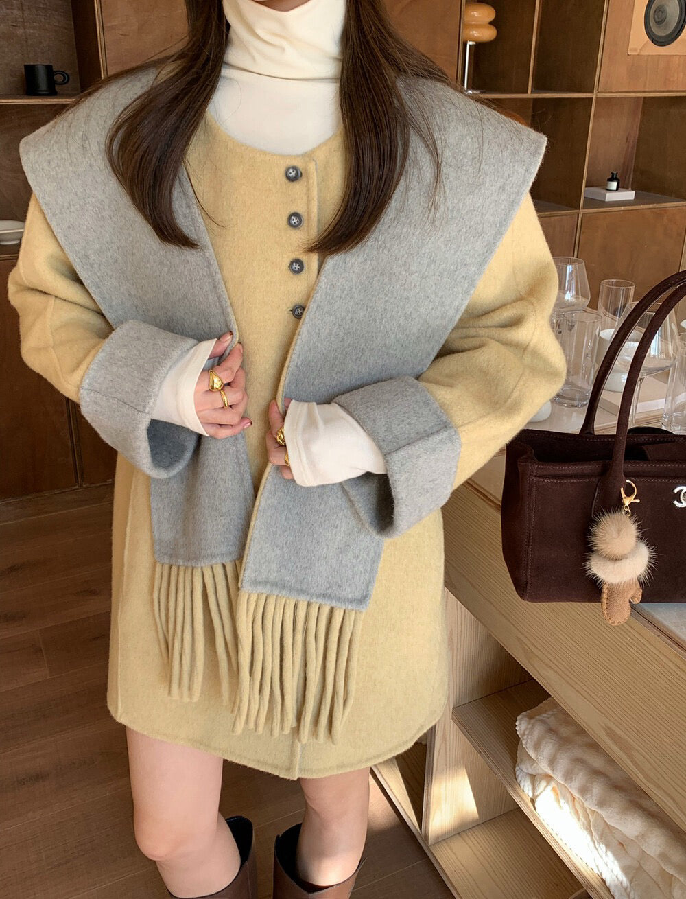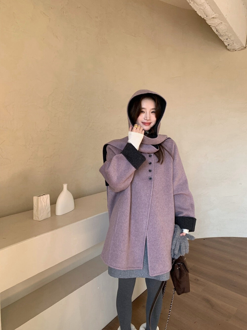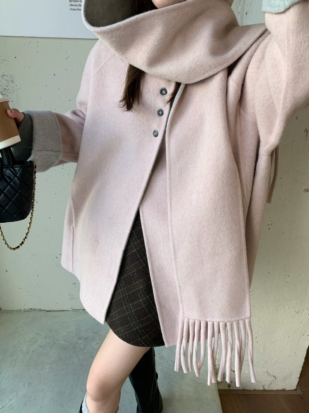 // 100%羊毛簡約高級感三粒鈕中長手工外套(連連帽頸巾)