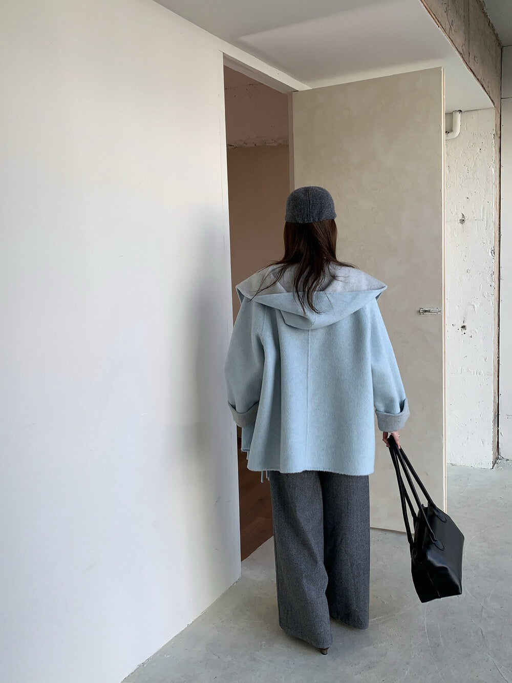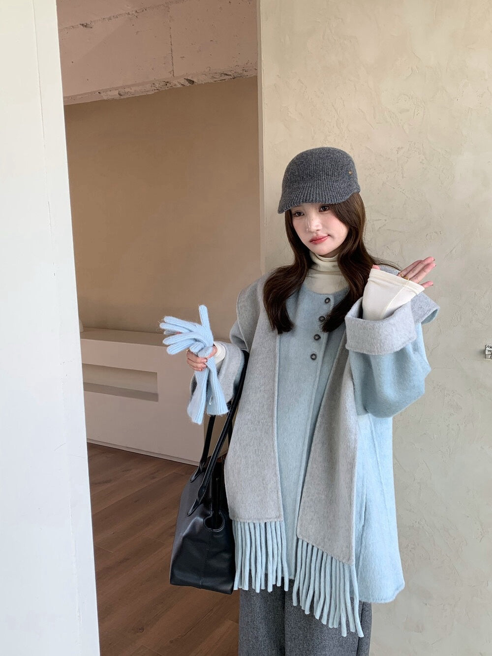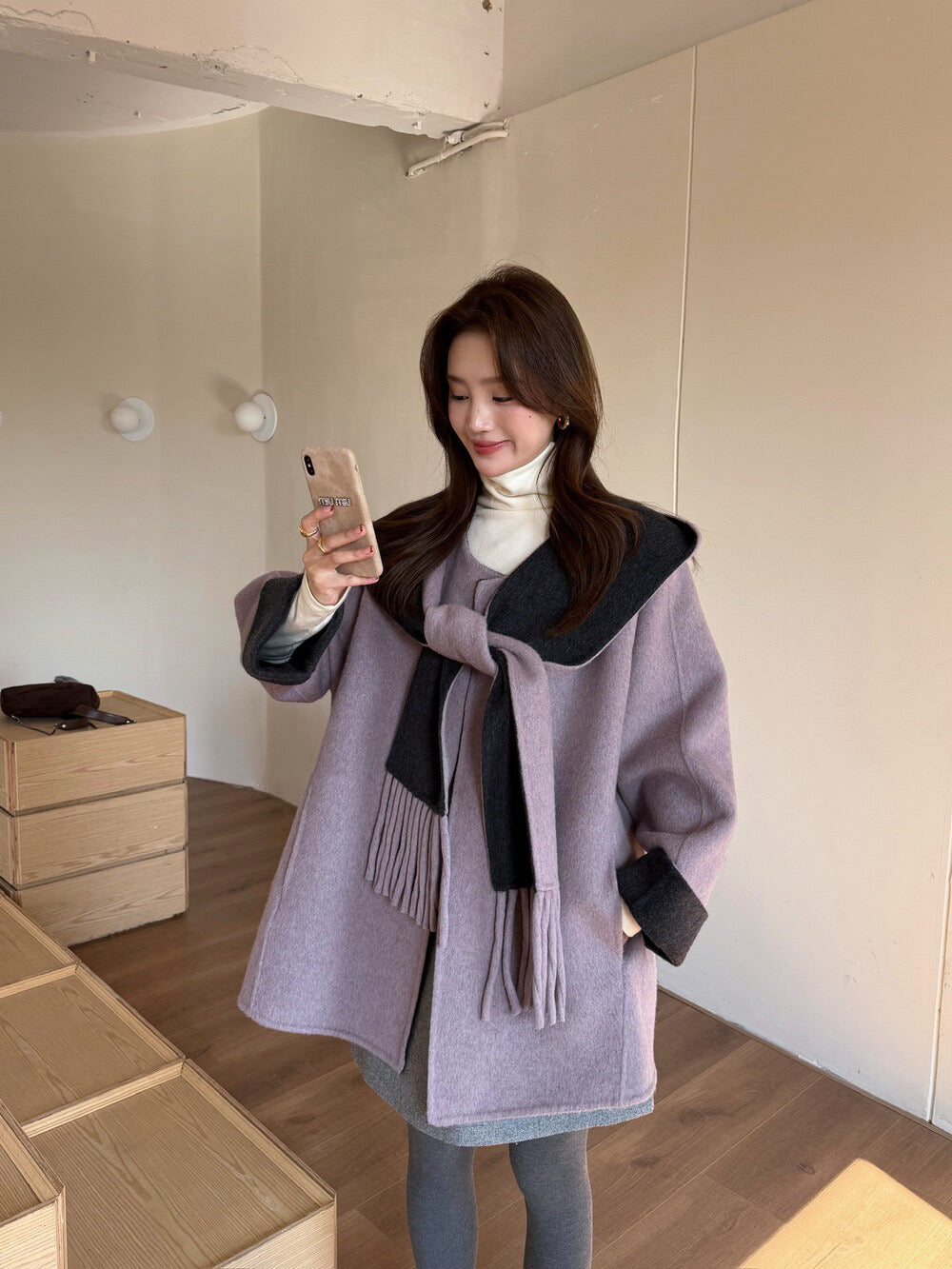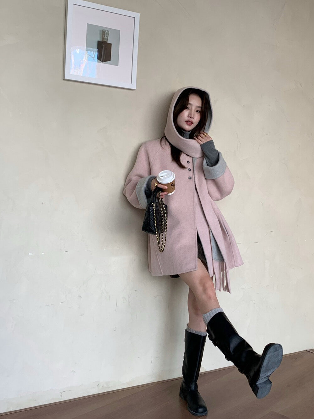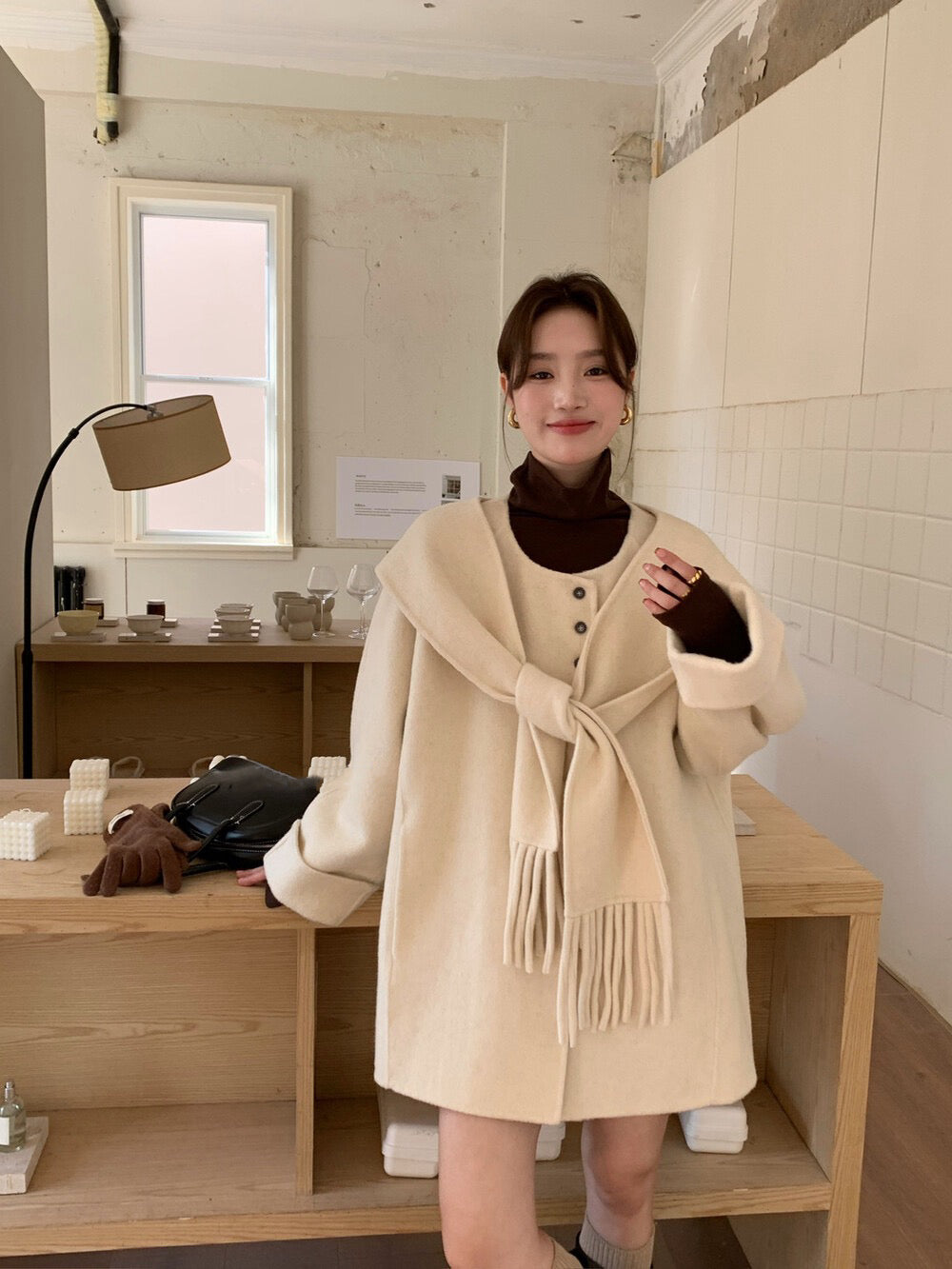 // 100%羊毛簡約高級感三粒鈕中長手工外套(連連帽頸巾)