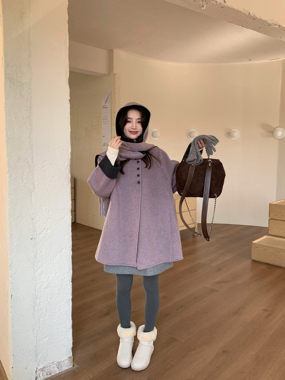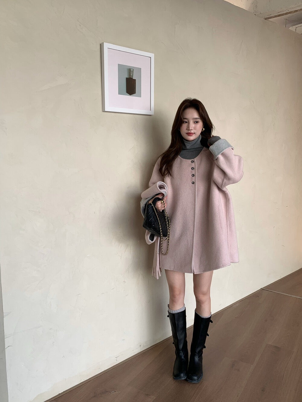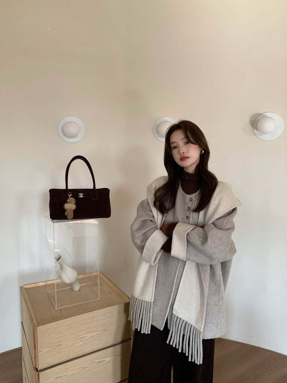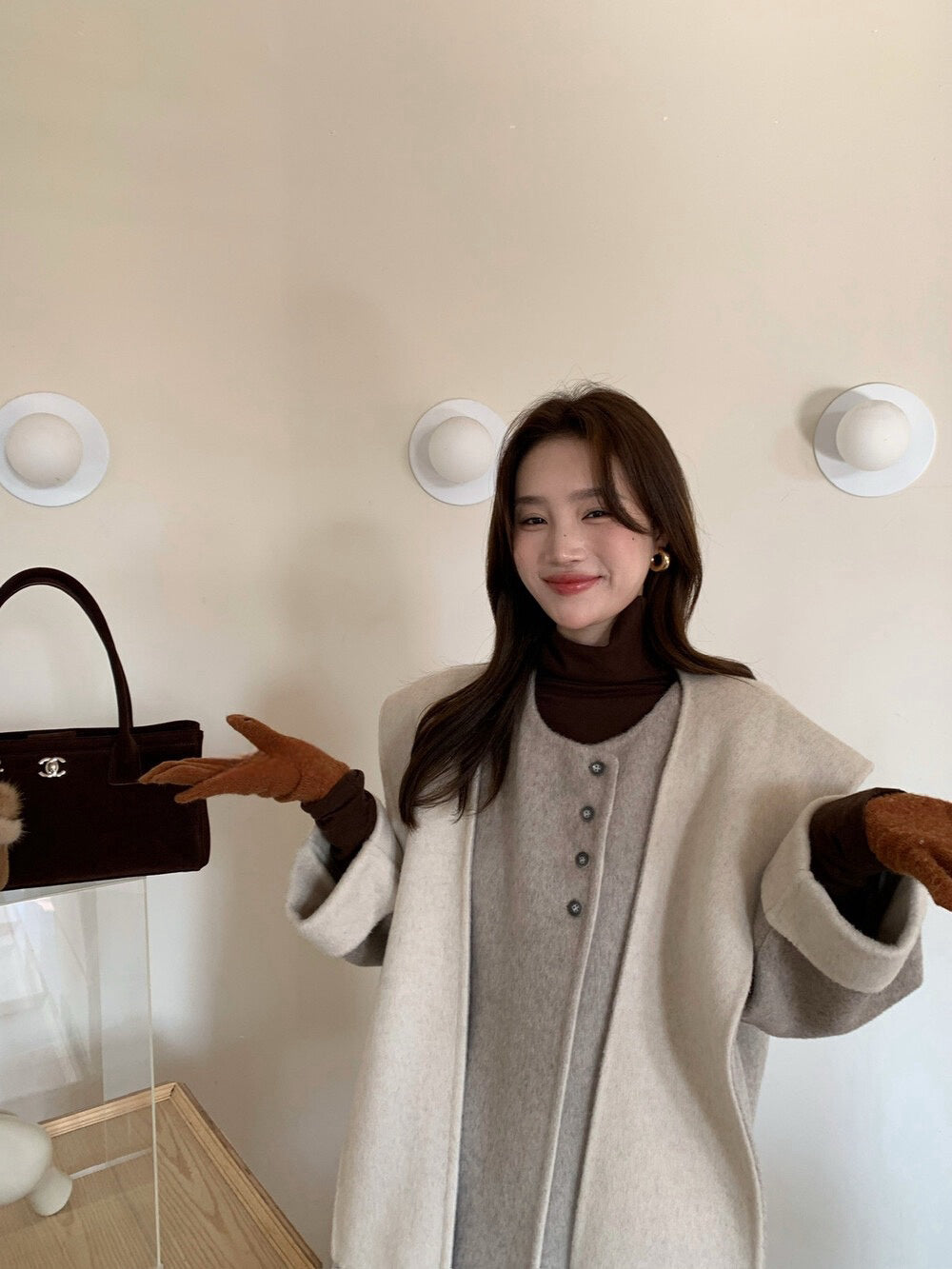 // 100%羊毛簡約高級感三粒鈕中長手工外套(連連帽頸巾)