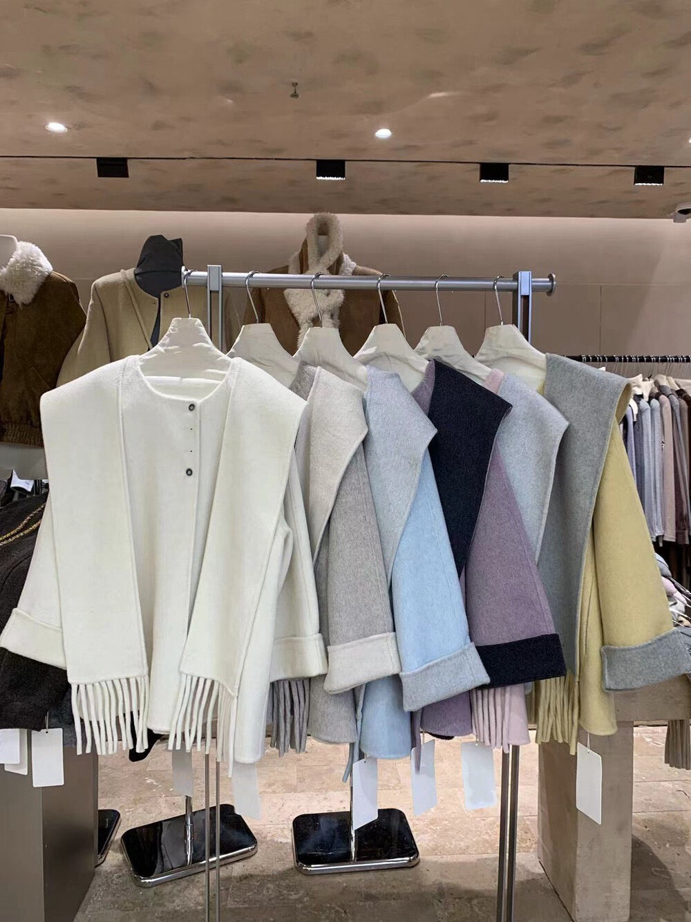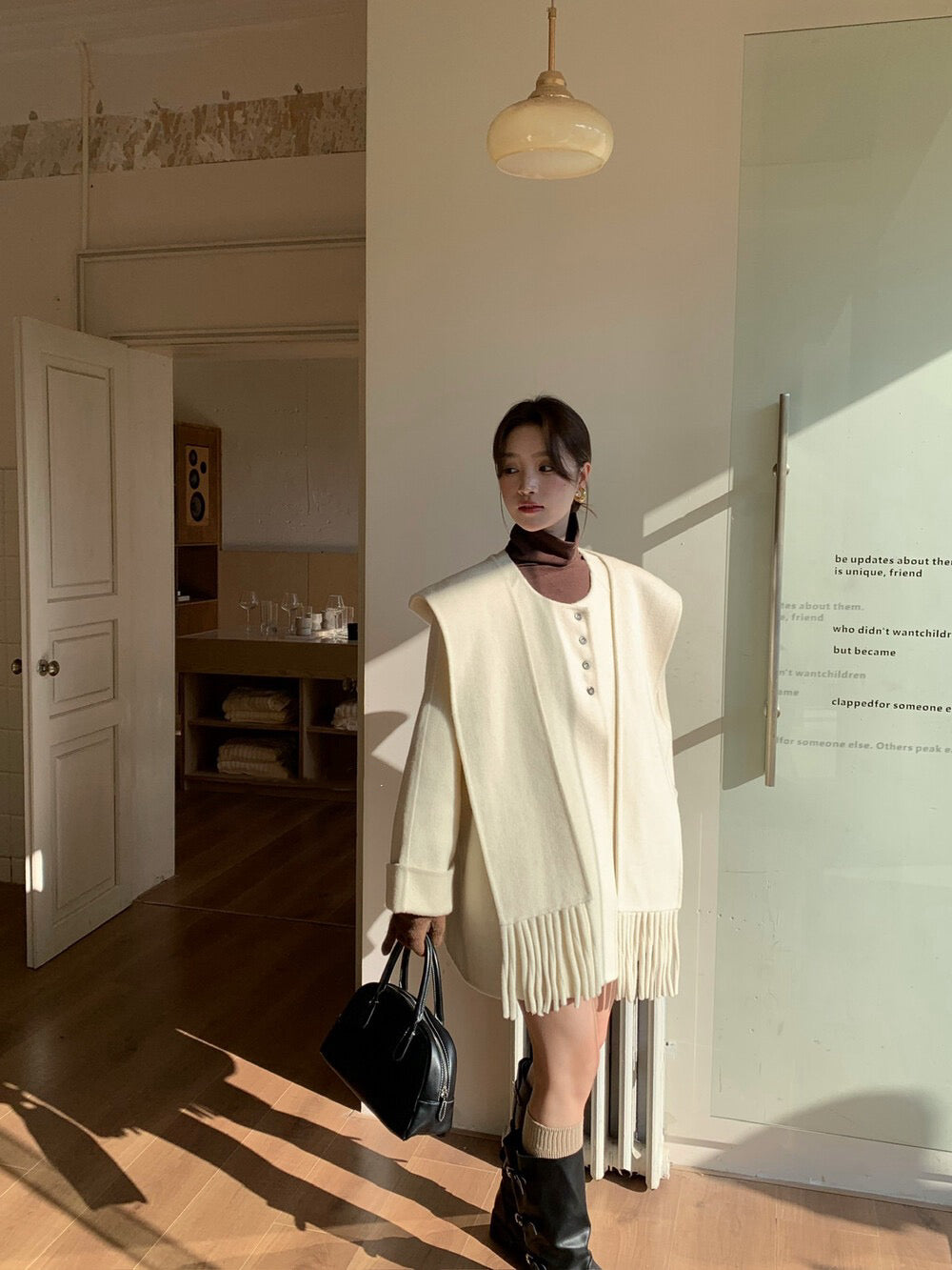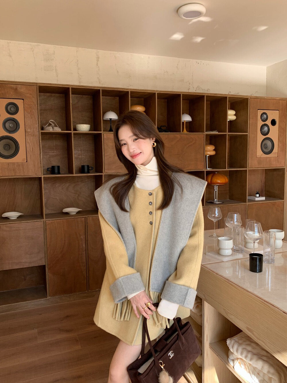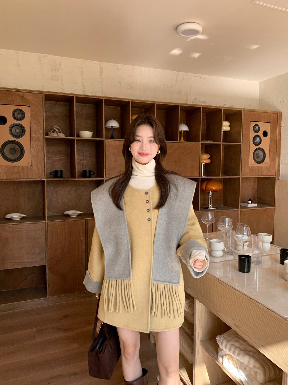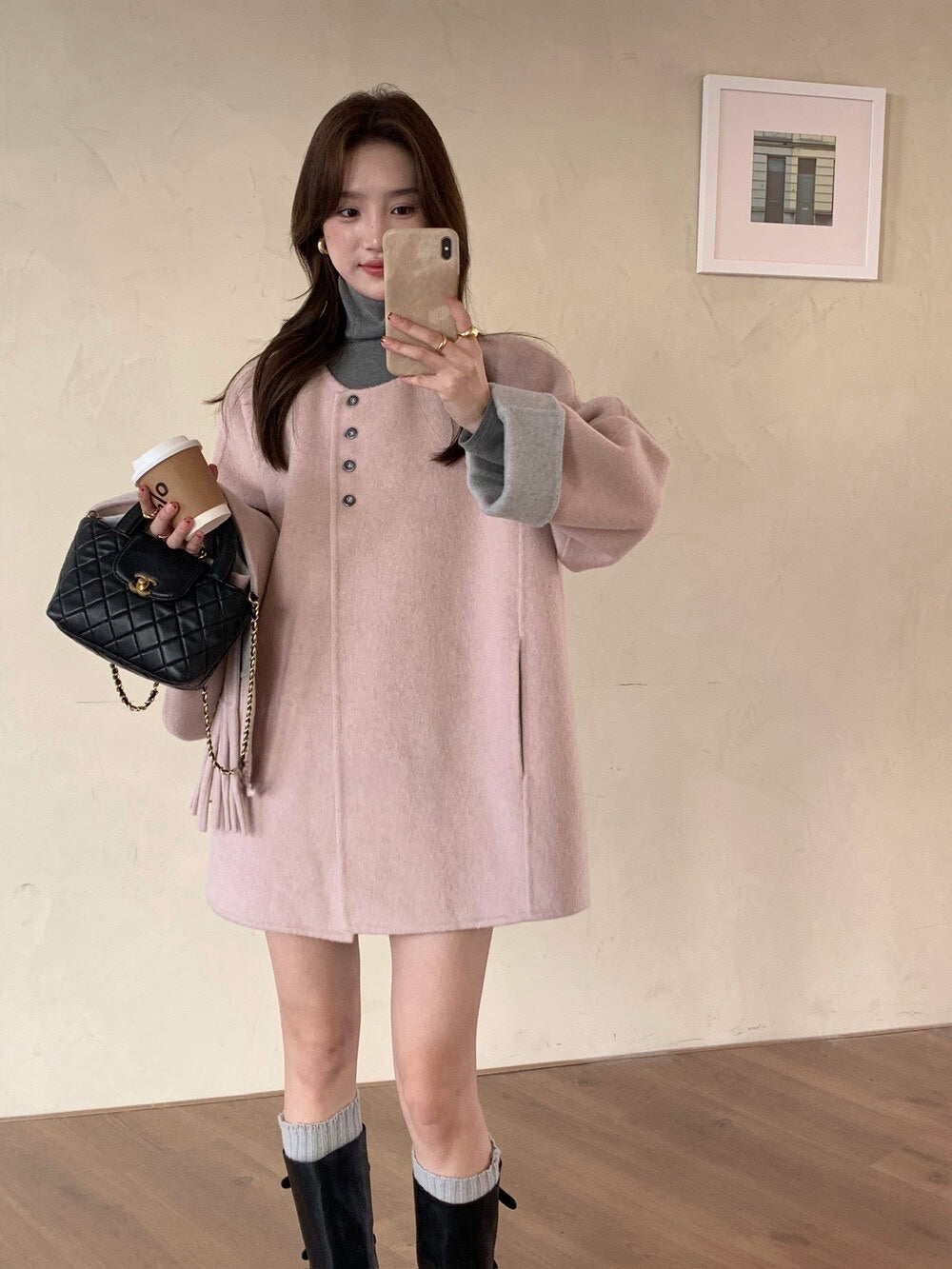 // 100%羊毛簡約高級感三粒鈕中長手工外套(連連帽頸巾)
