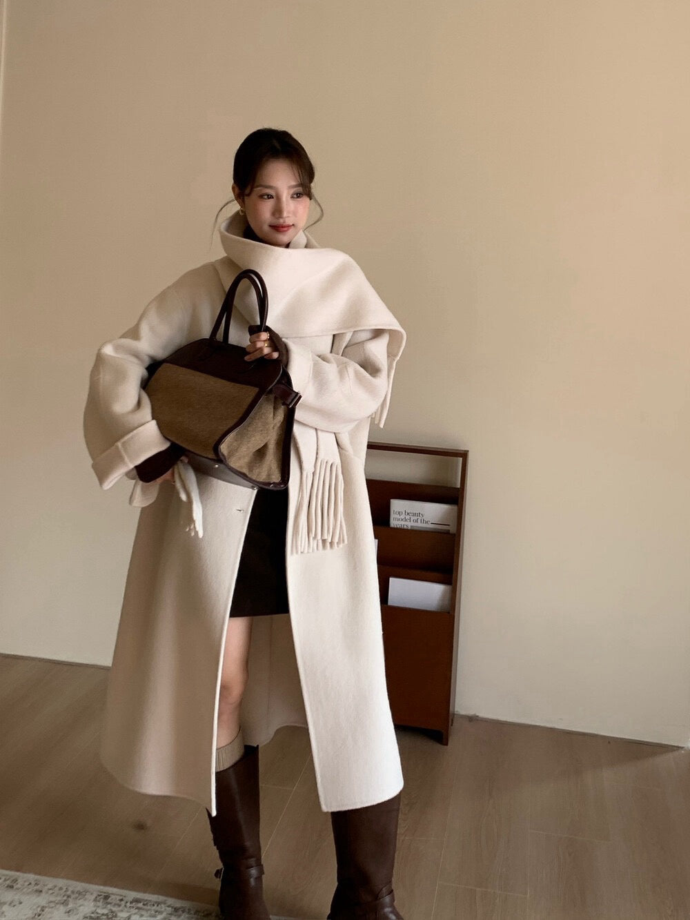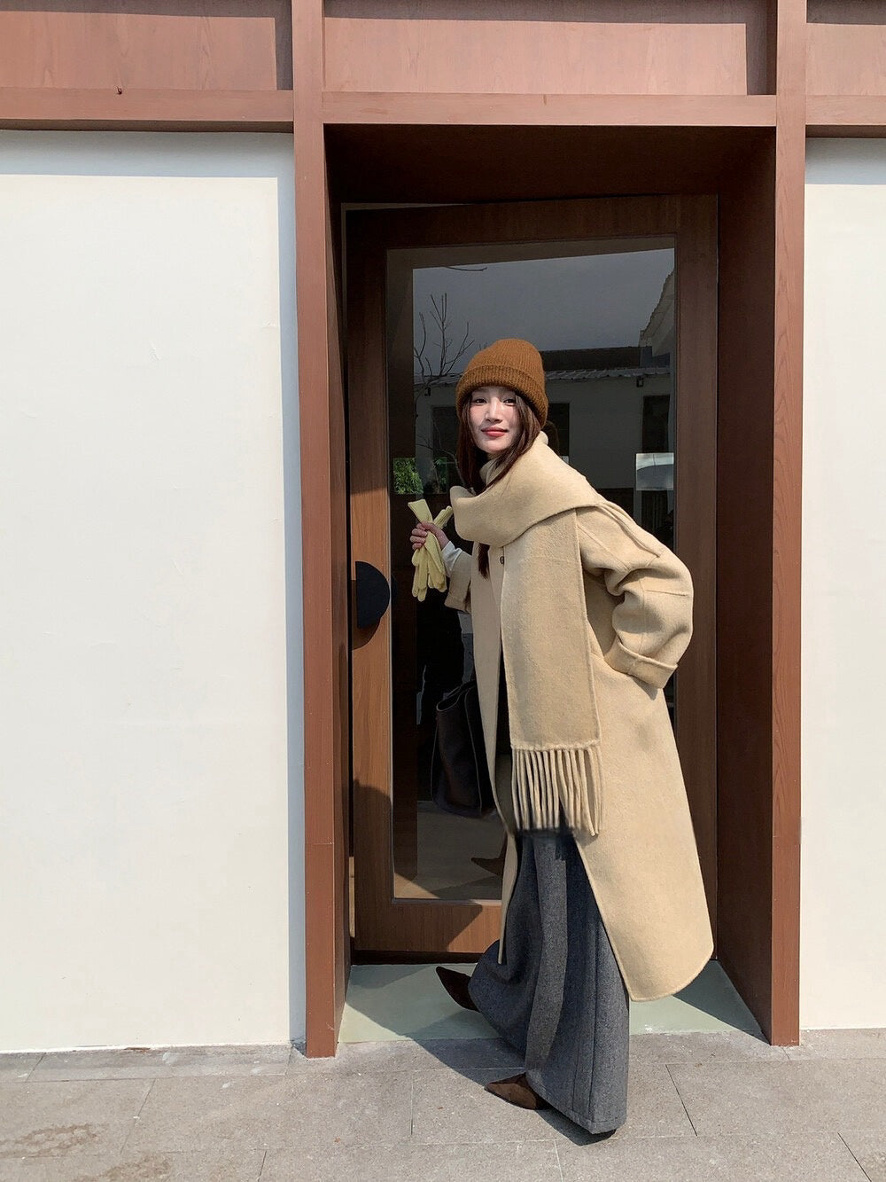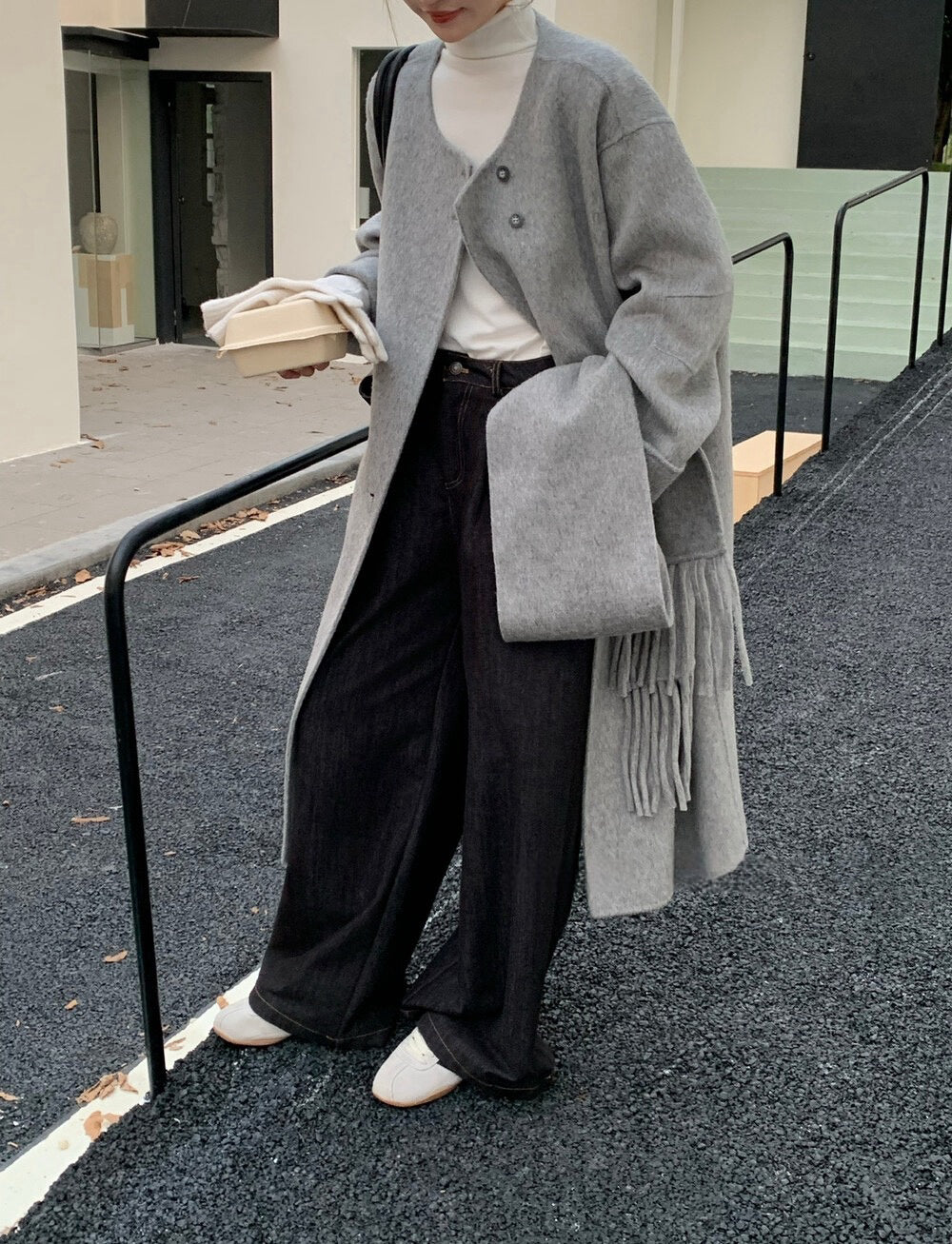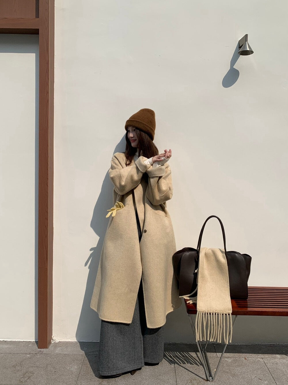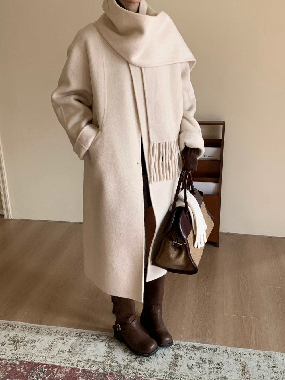 // 100%wool簡約圓領手工雙面長外套(連頸巾)