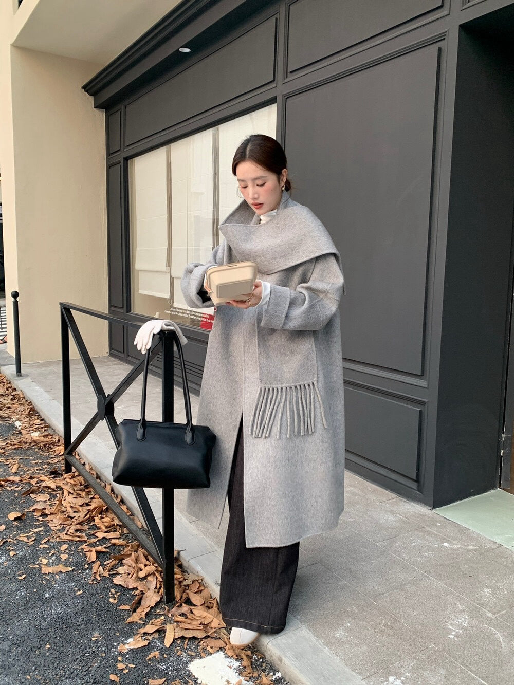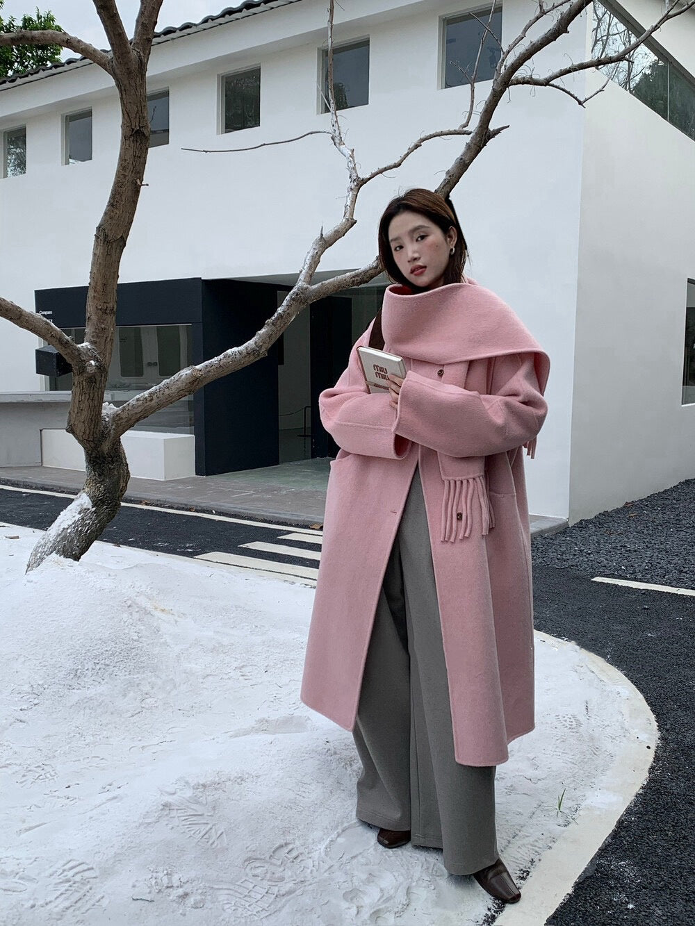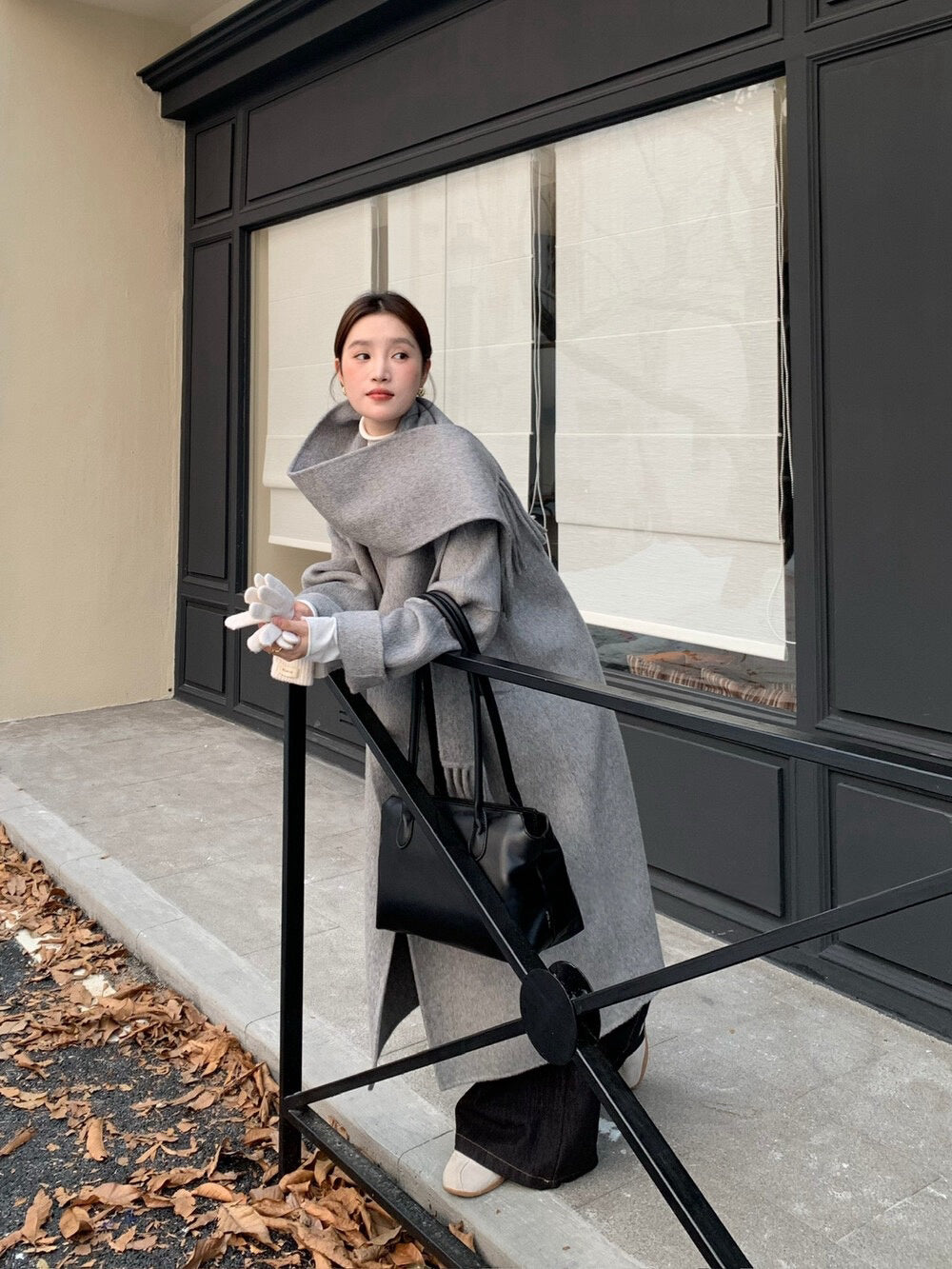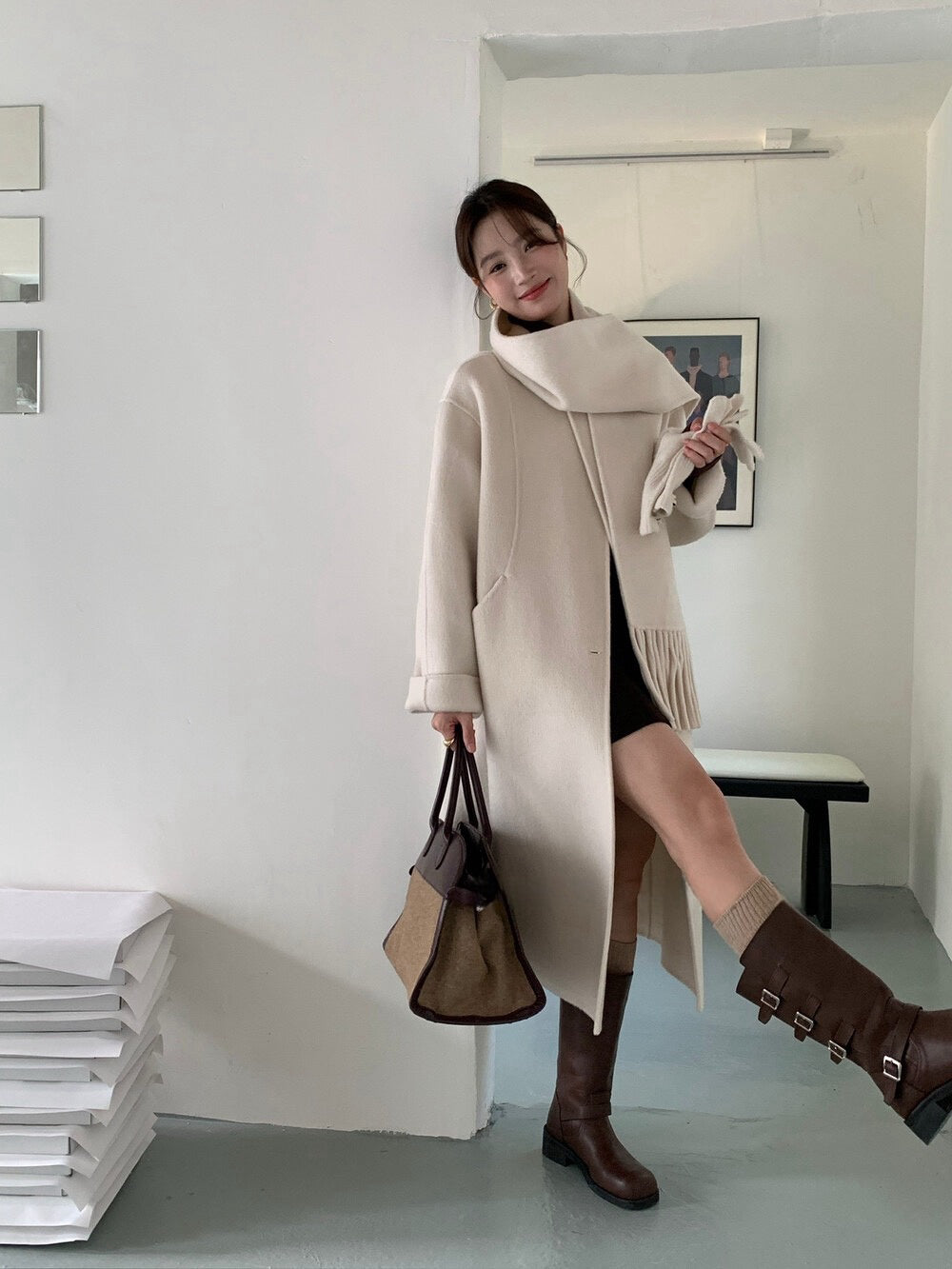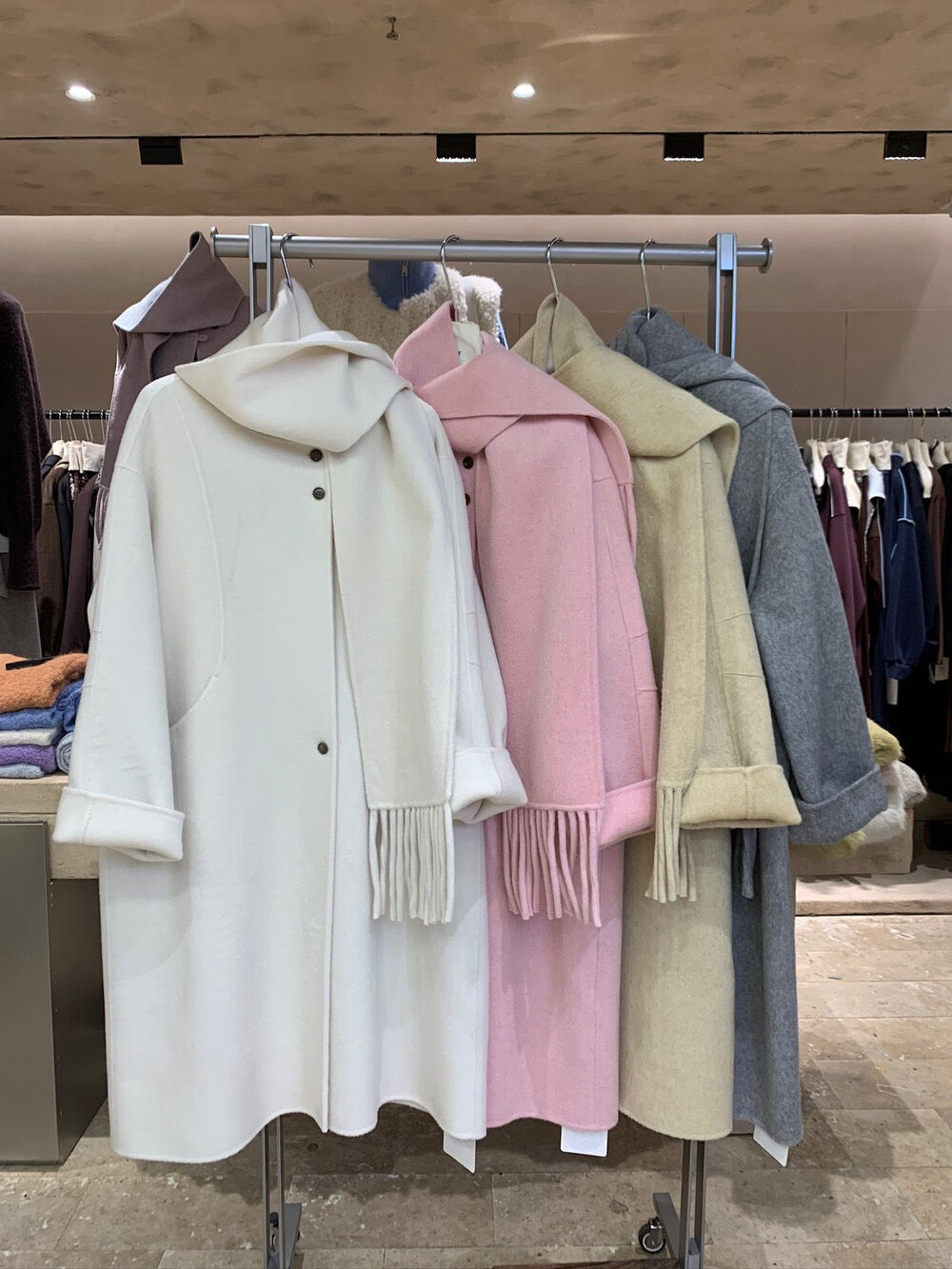 // 100%wool簡約圓領手工雙面長外套(連頸巾)