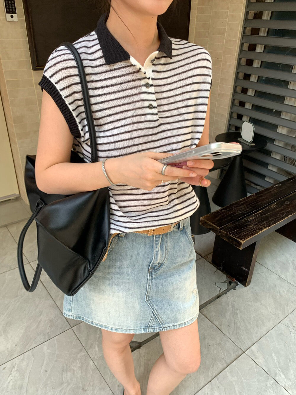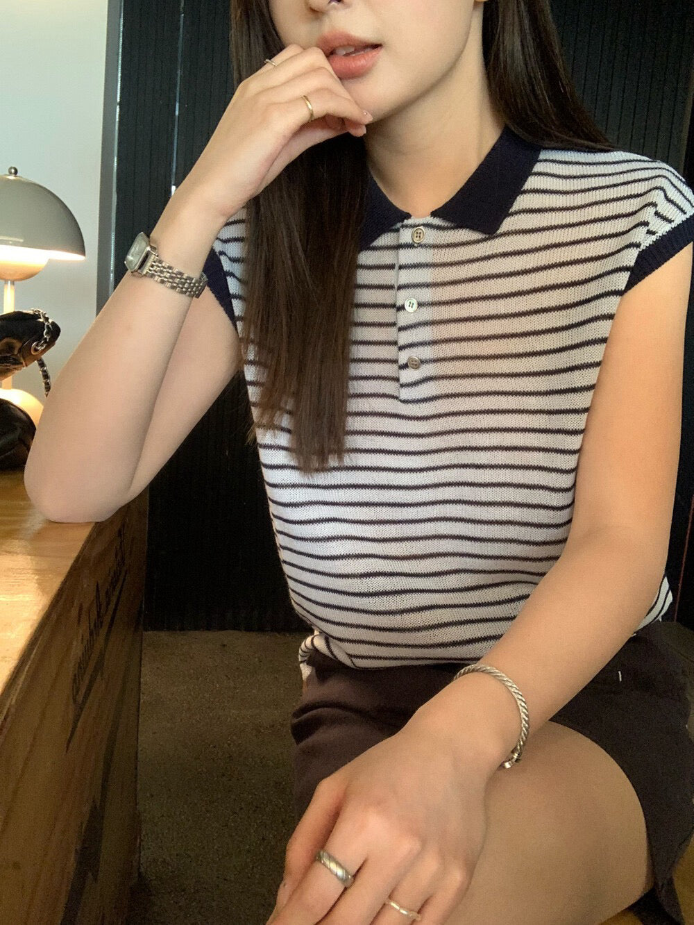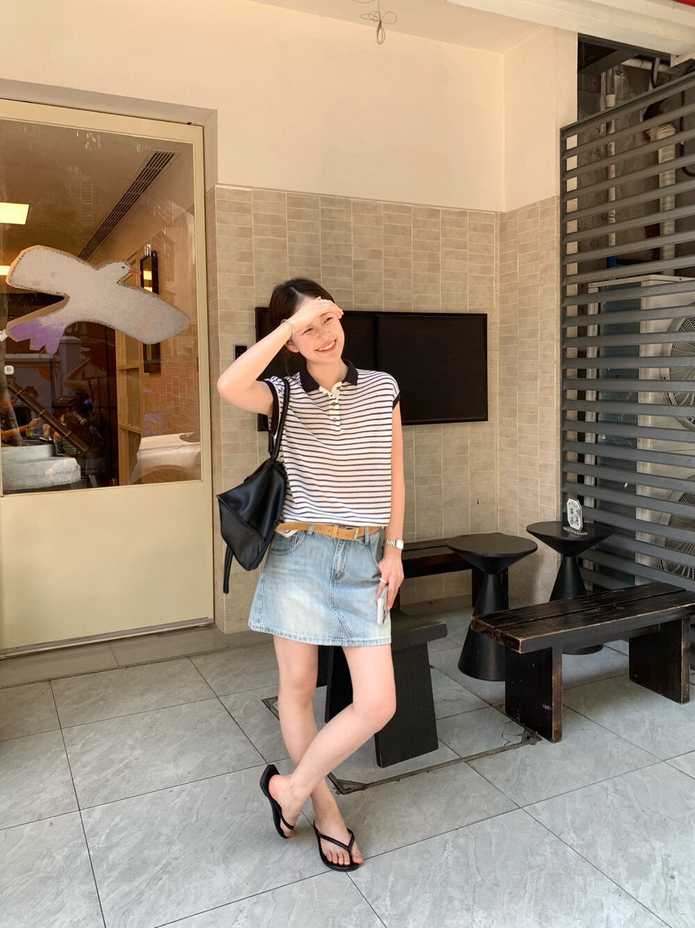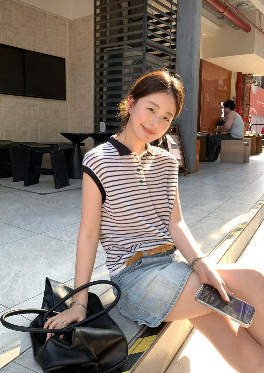 // 28%羊毛撞色邊polo間條針織背心