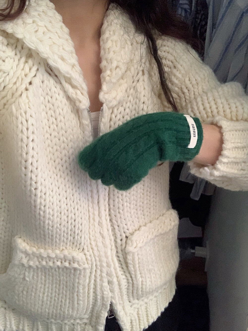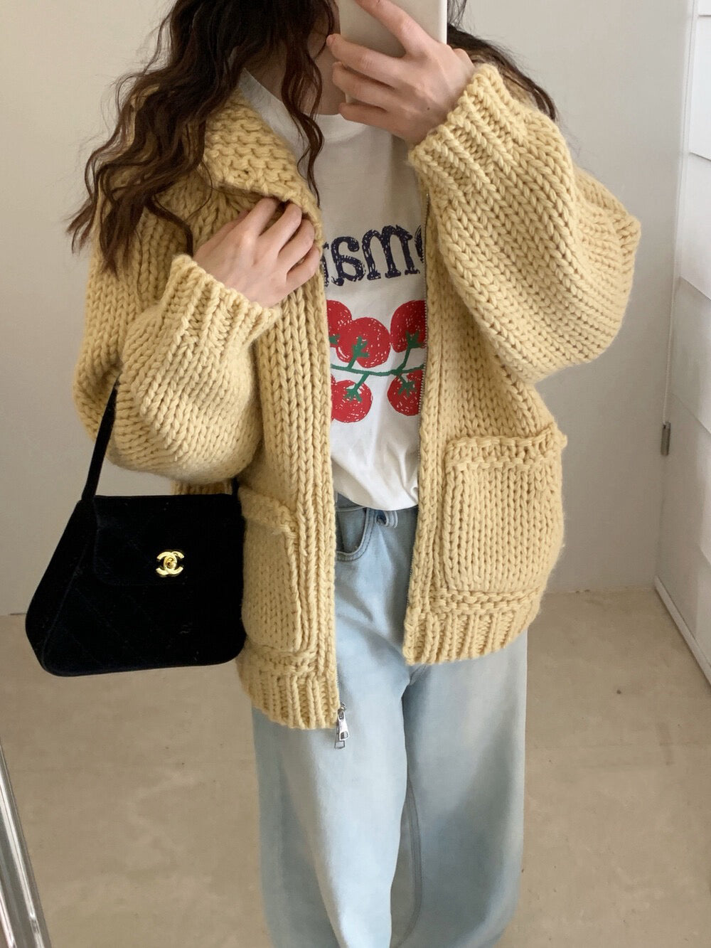 // 30%wool粗棒針手工織感圓翻領口袋拉鍊CD