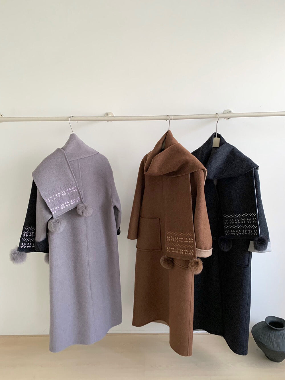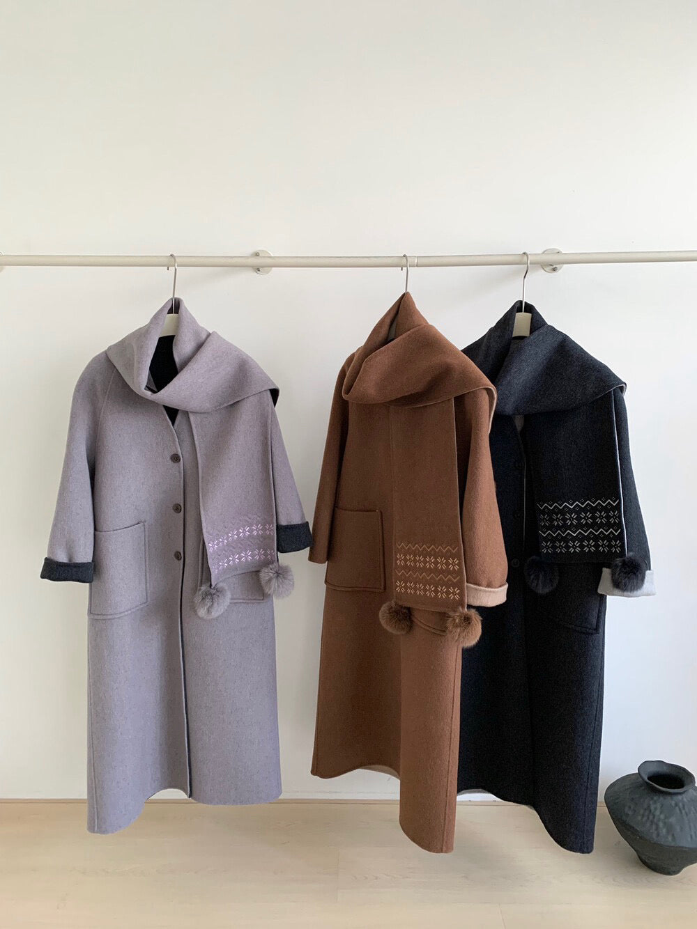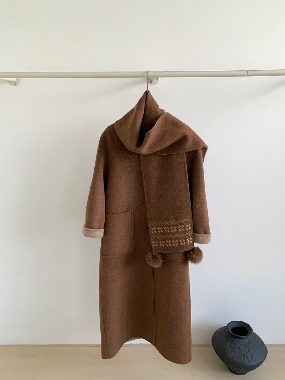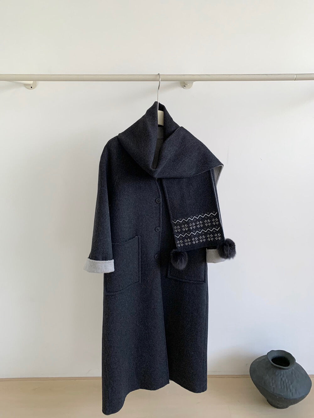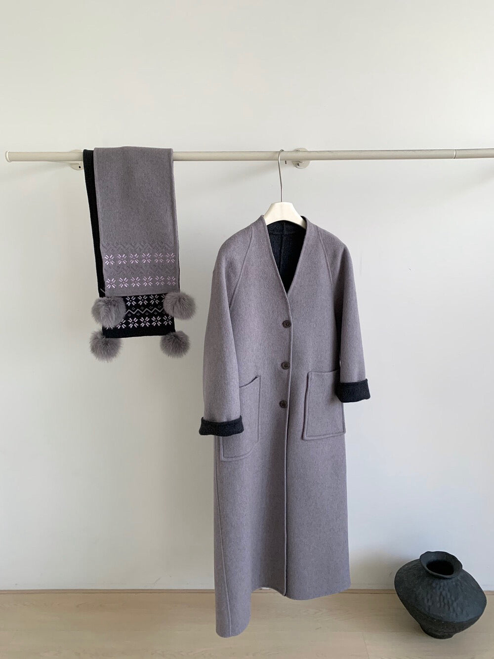 // 70%綿羊毛簡約插肩V領長款手工羊毛外套(連頸巾)