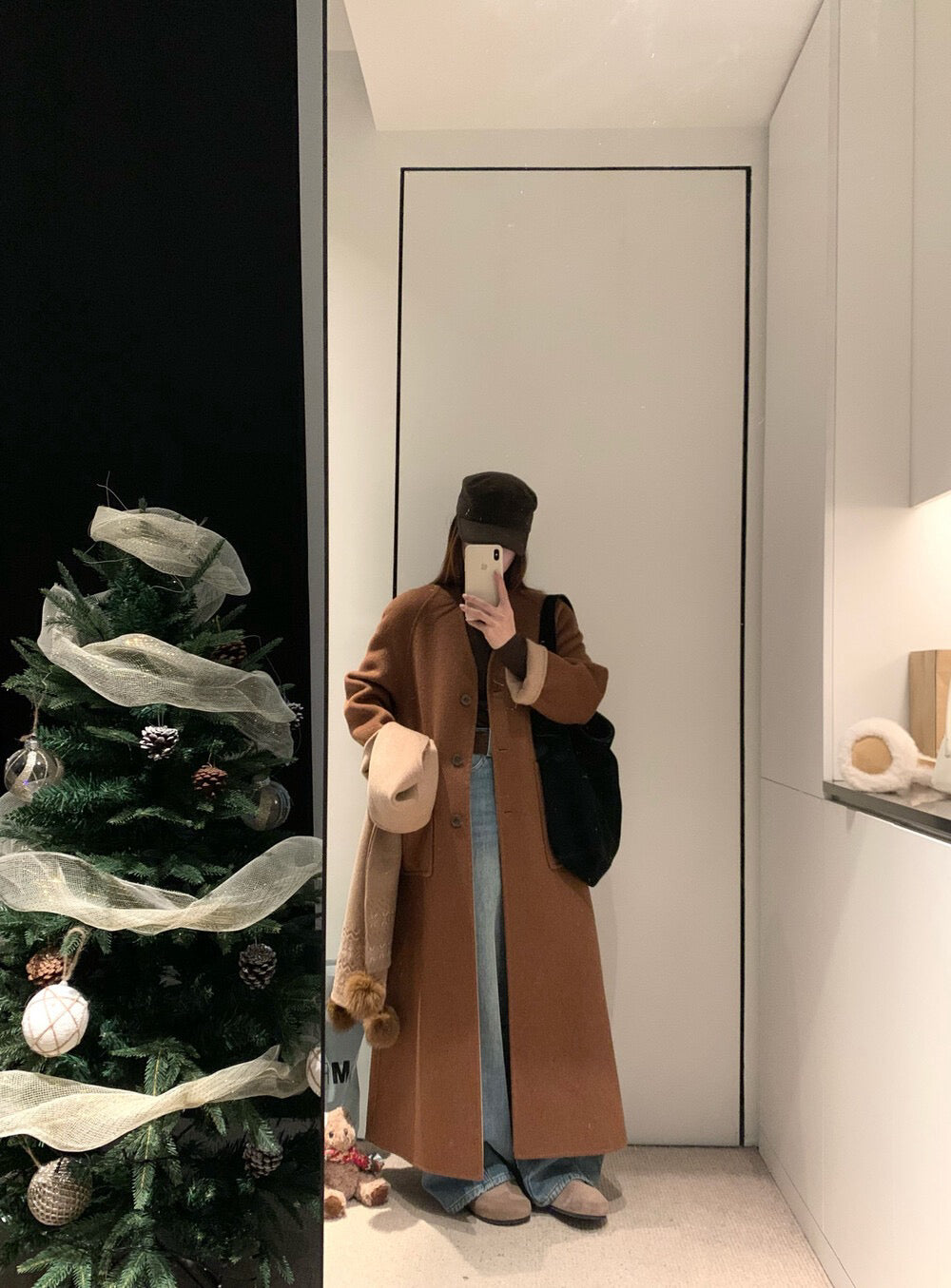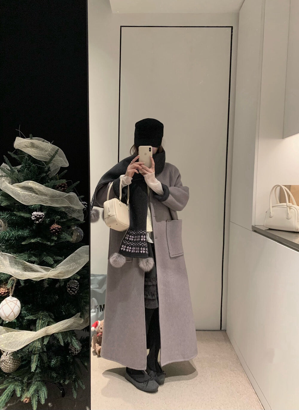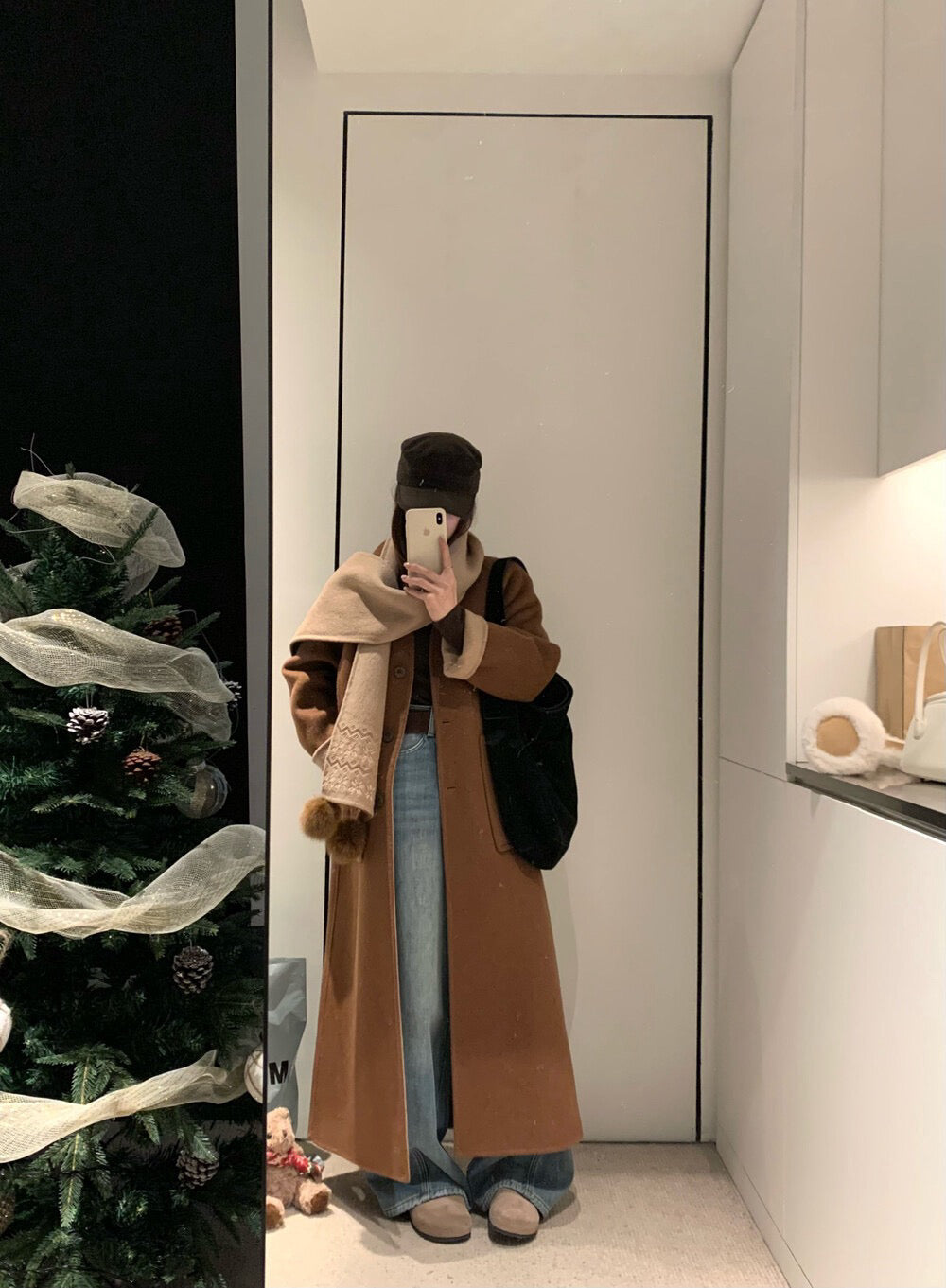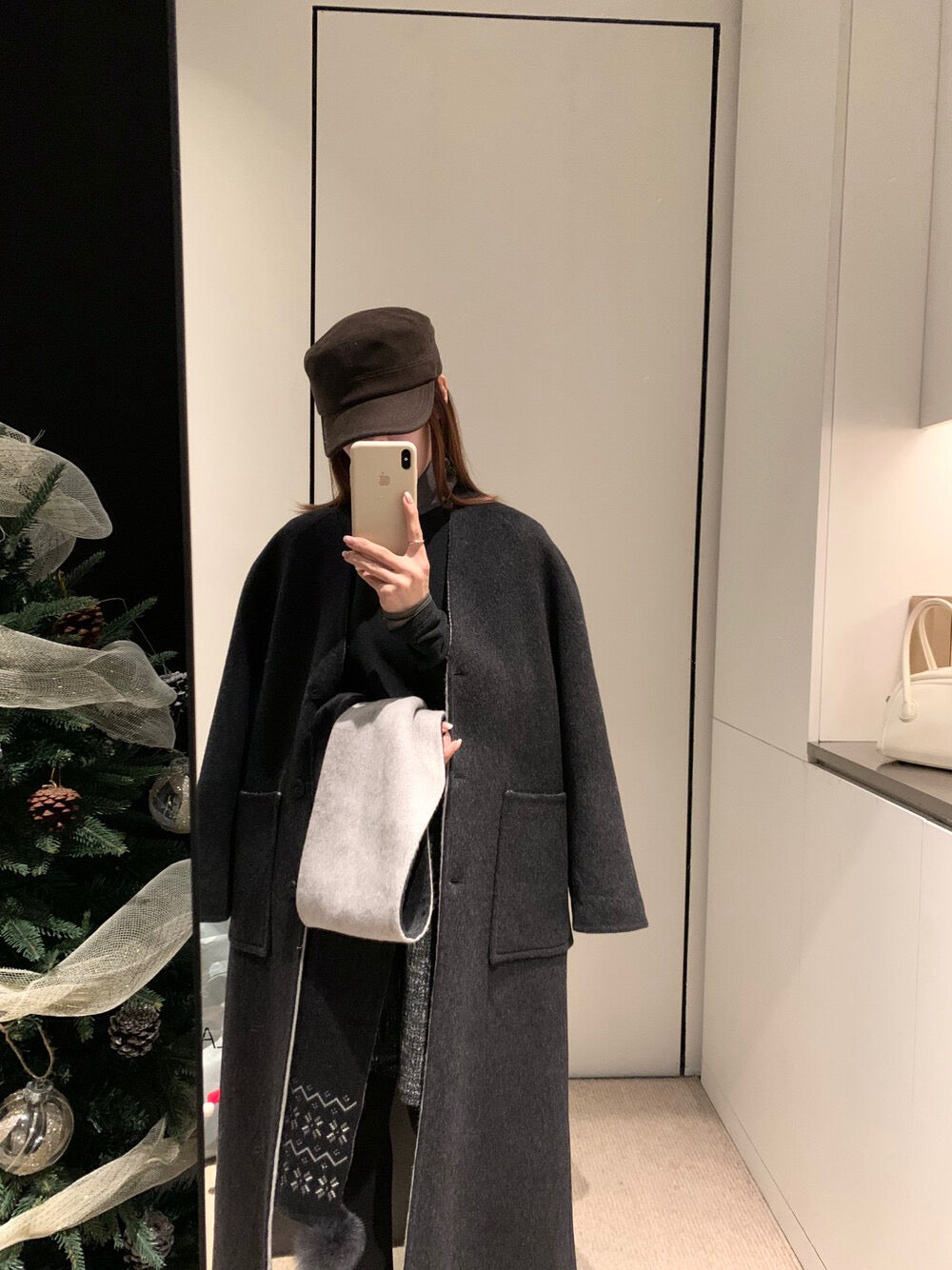 // 70%綿羊毛簡約插肩V領長款手工羊毛外套(連頸巾)