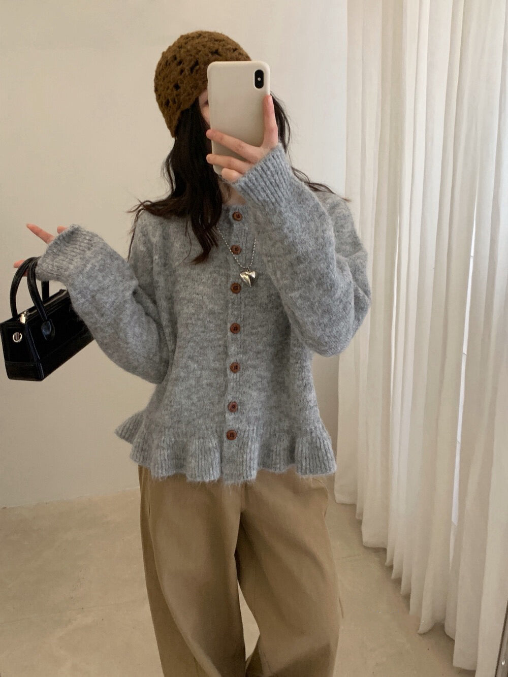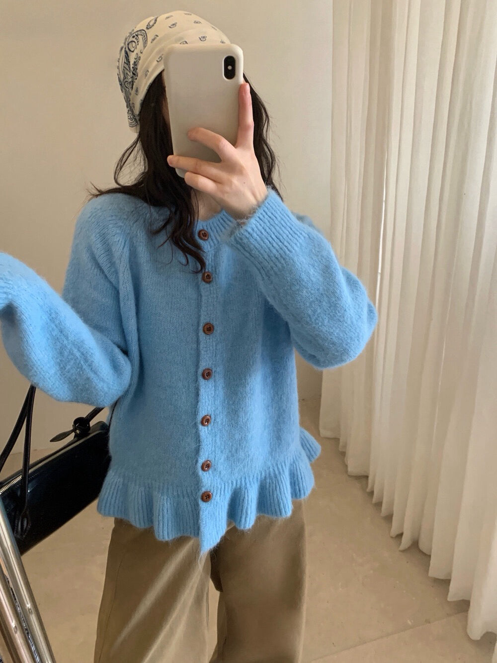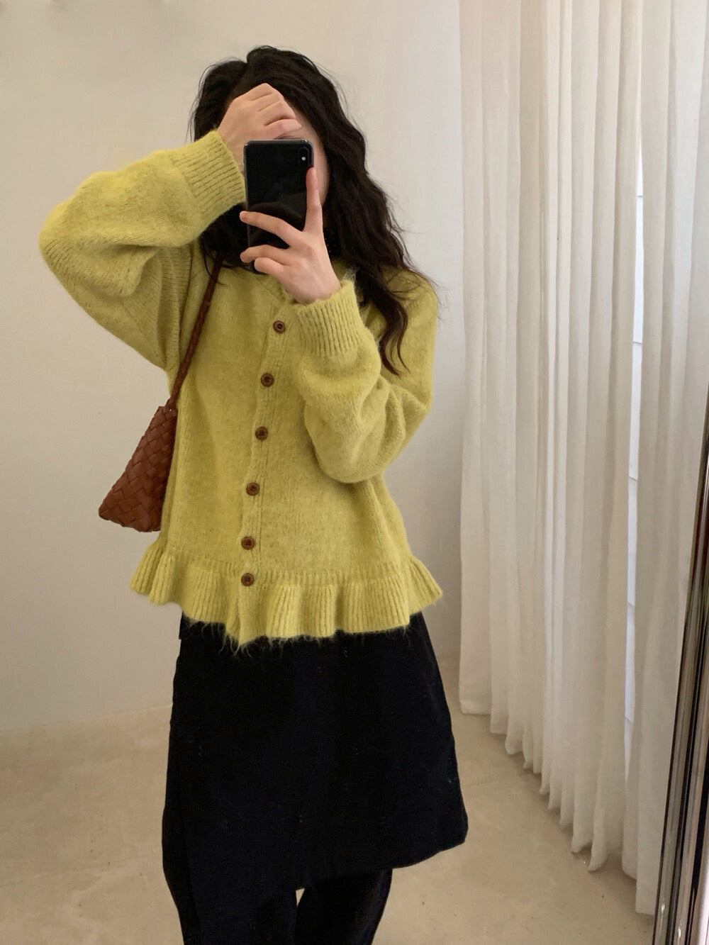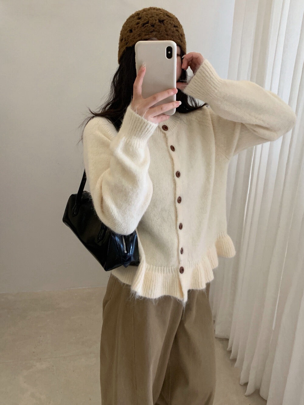 // 8%綿羊毛荷葉花邊腳排扣毛衣