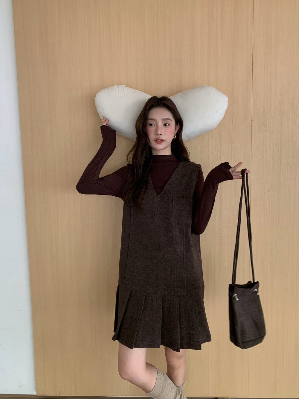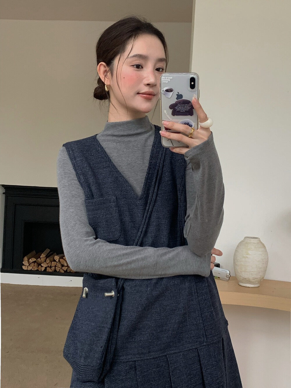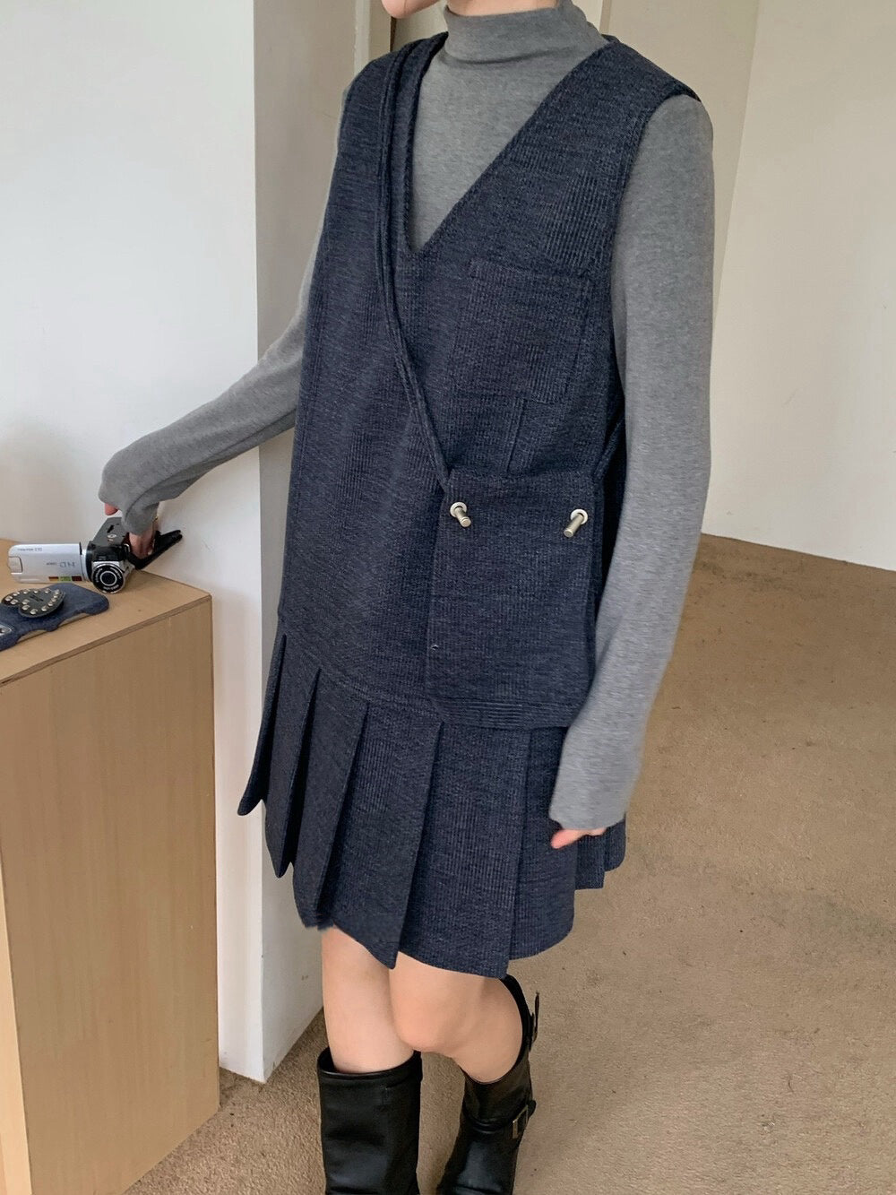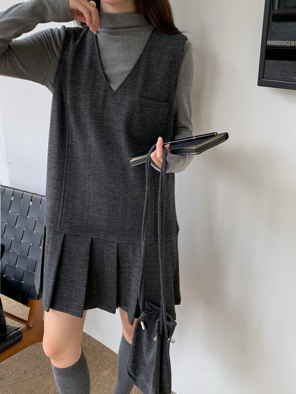 // V領百褶腳背心OPS+高領彈性打底兩件套(連袋仔)