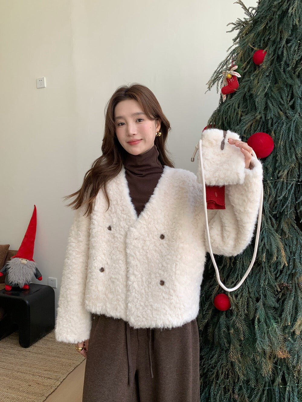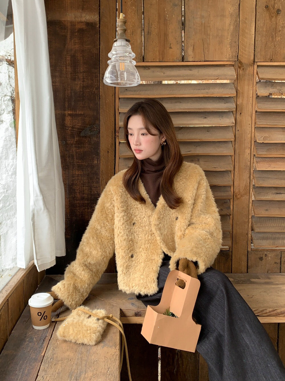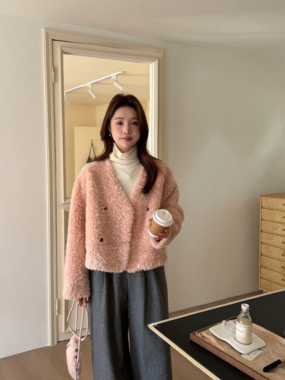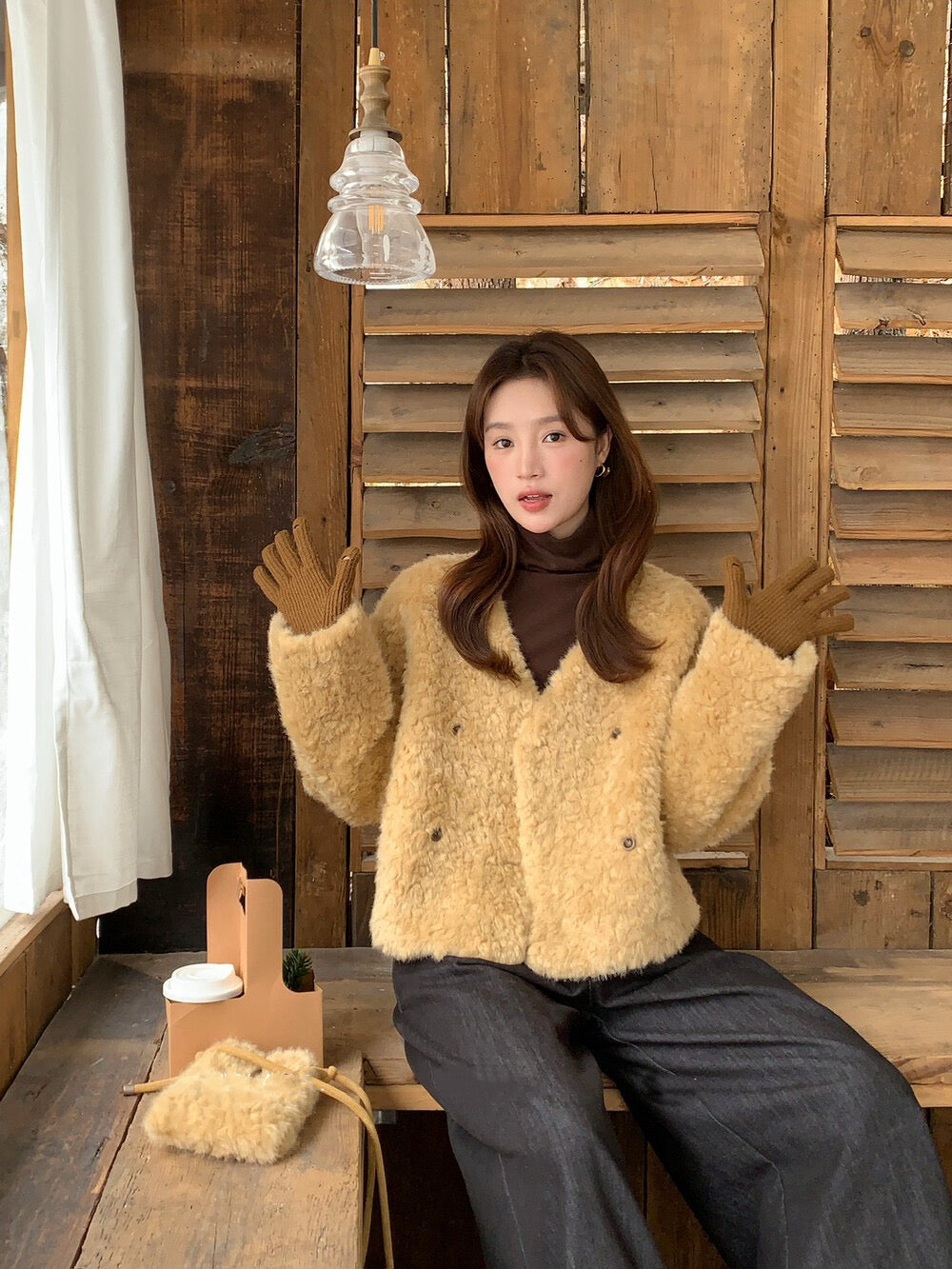 // V領雙排扣毛毛皮毛一體外套(連袋仔)