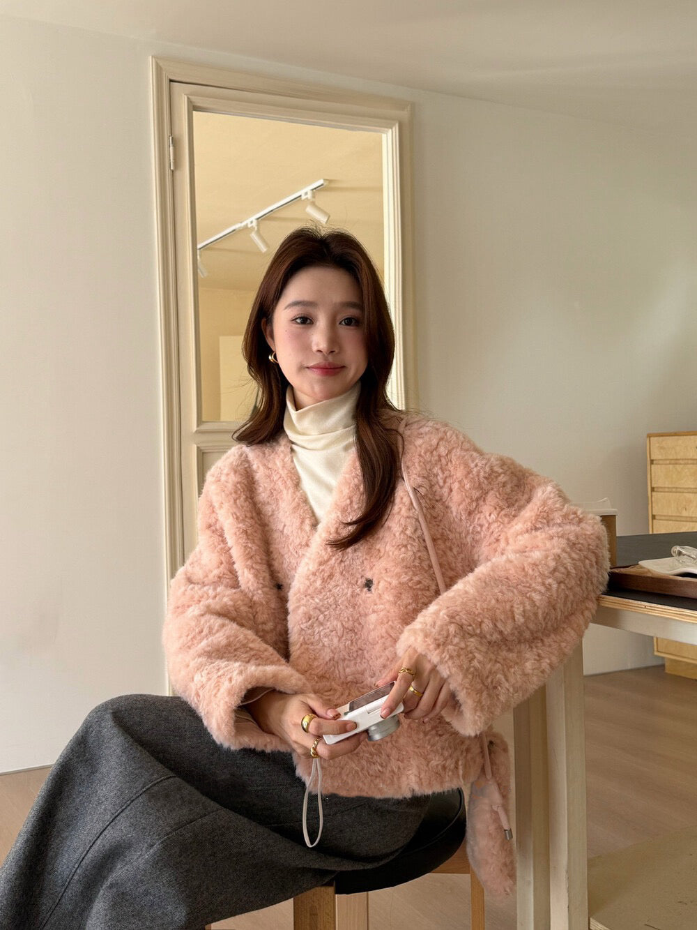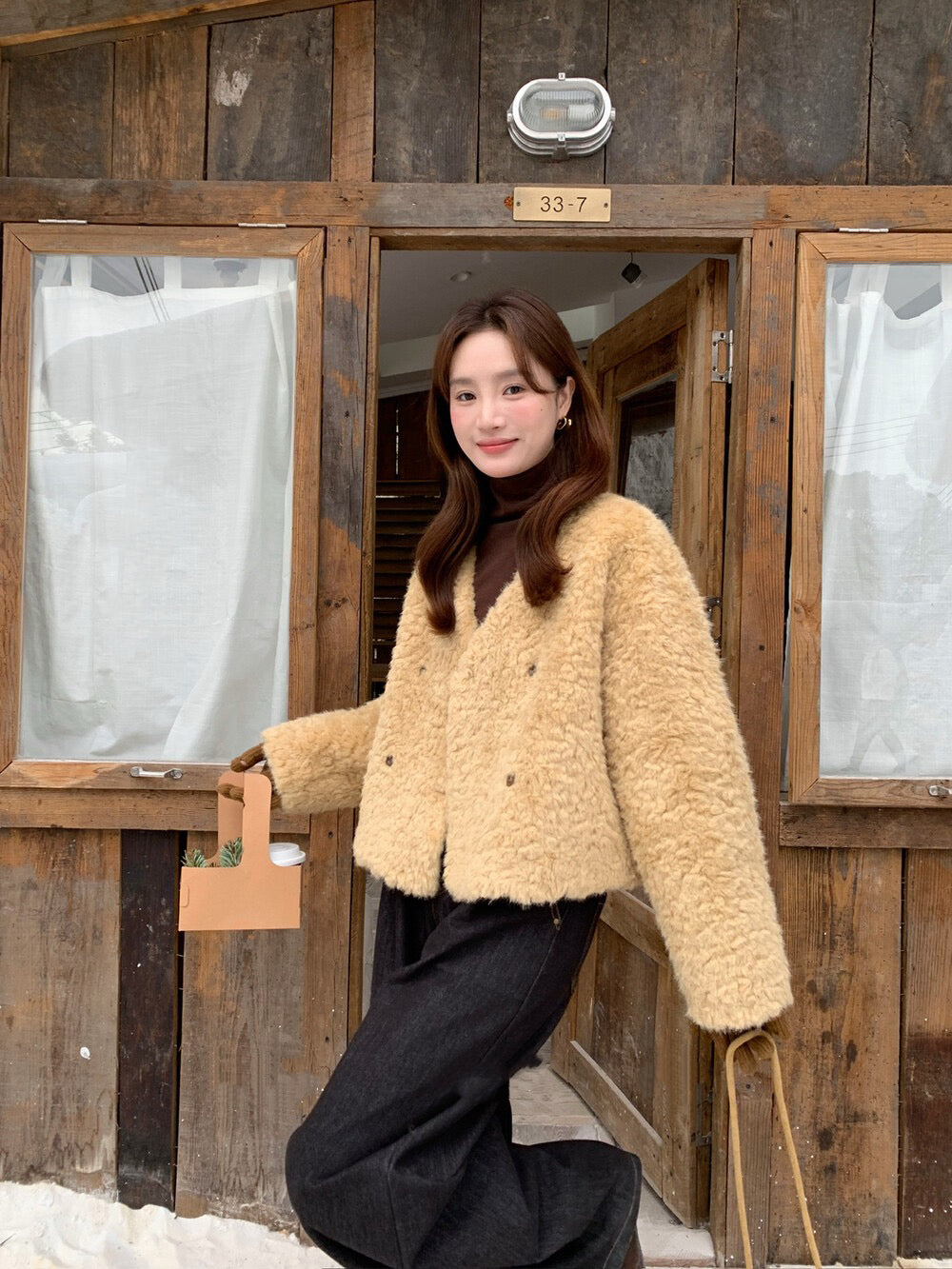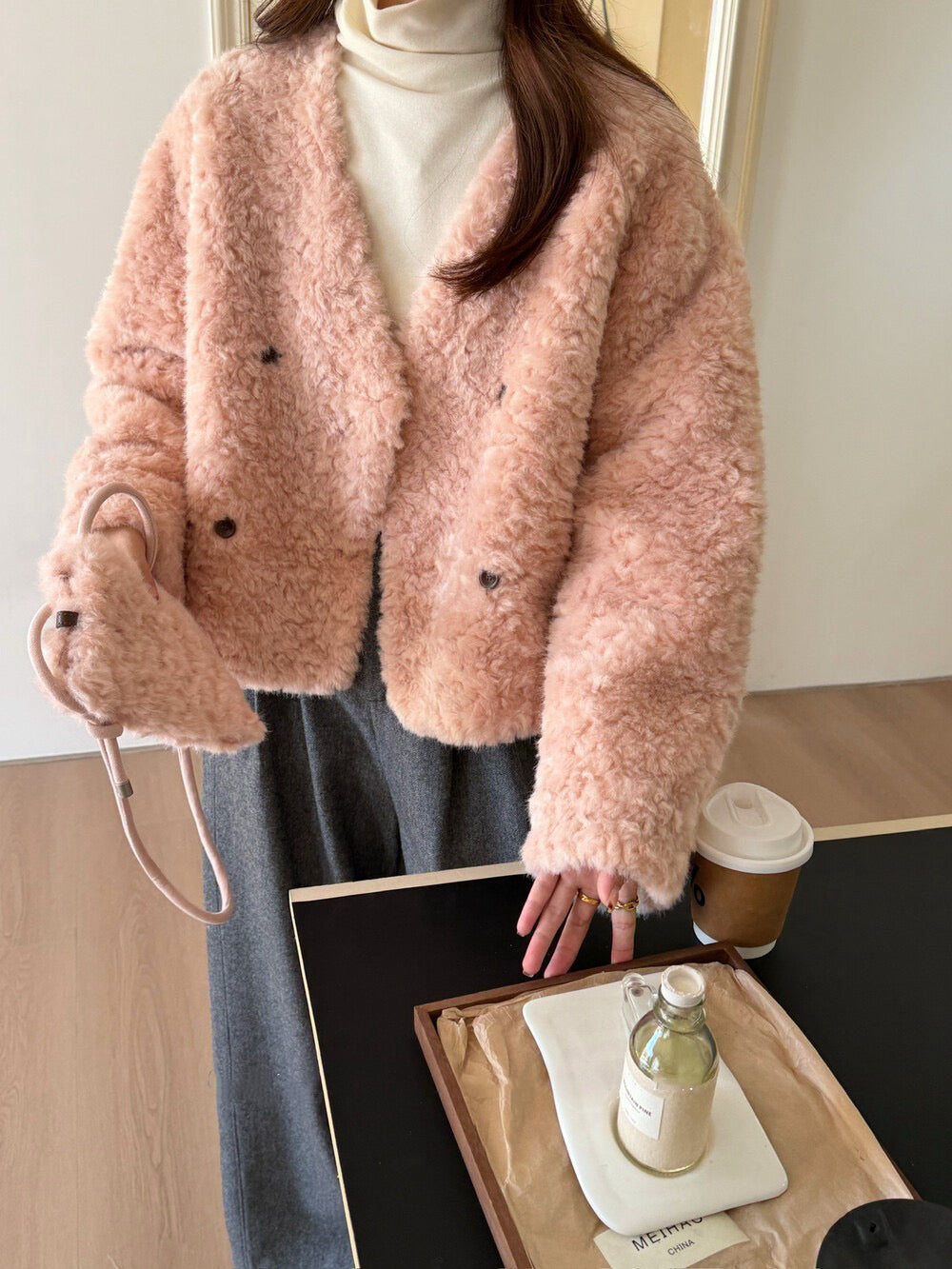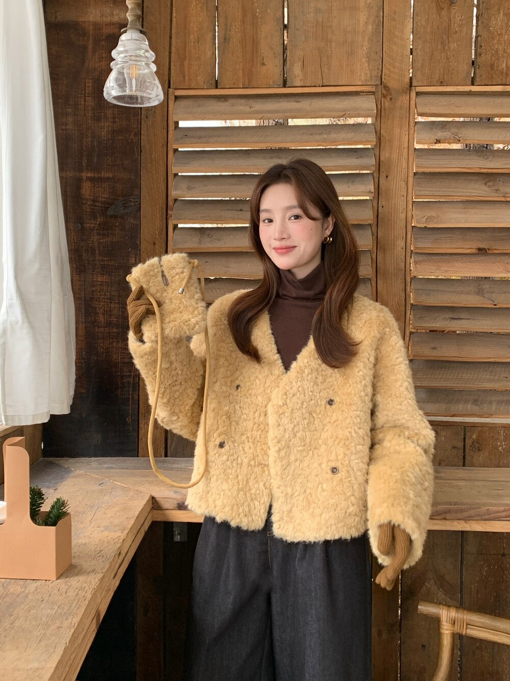 // V領雙排扣毛毛皮毛一體外套(連袋仔)
