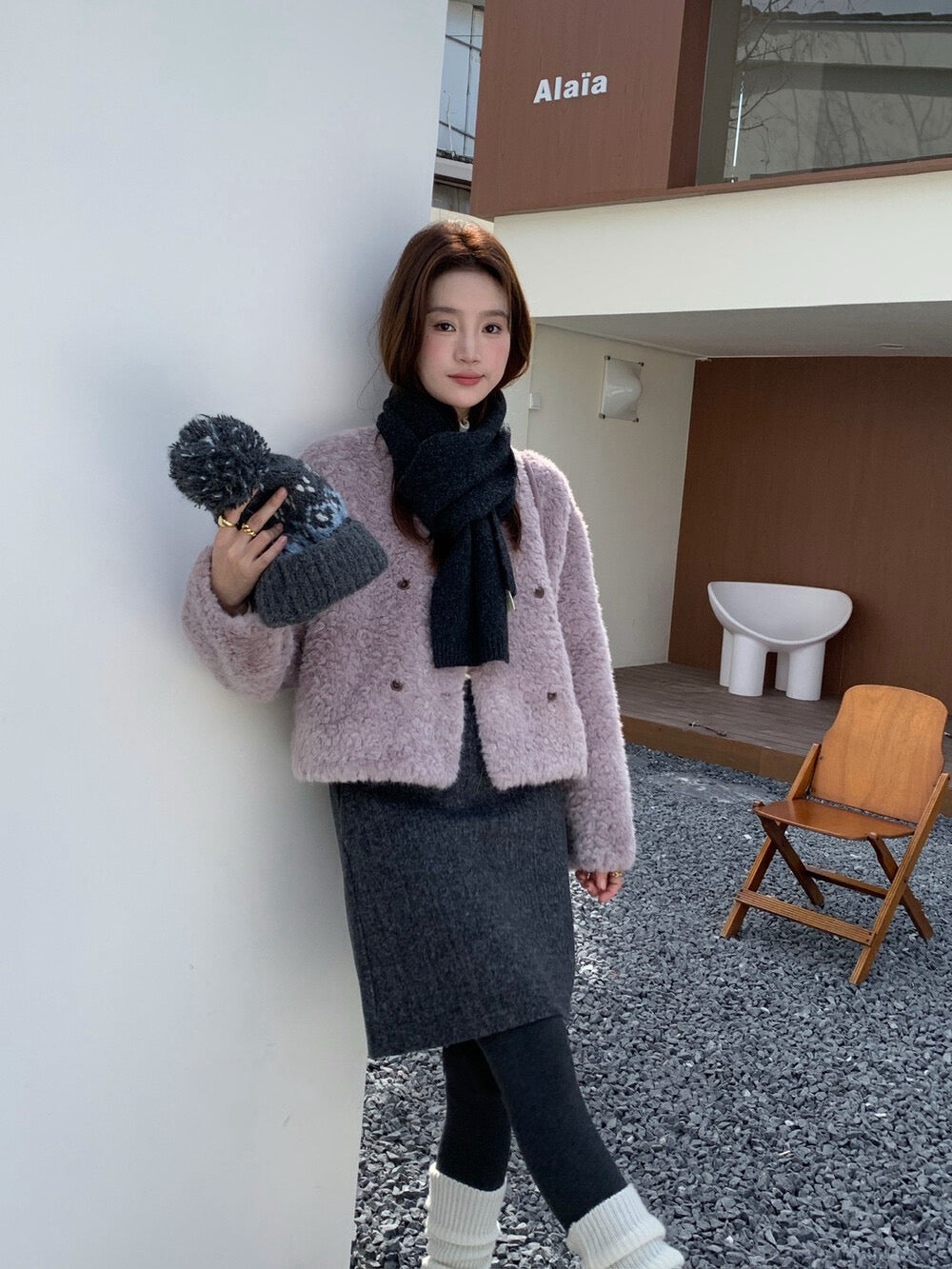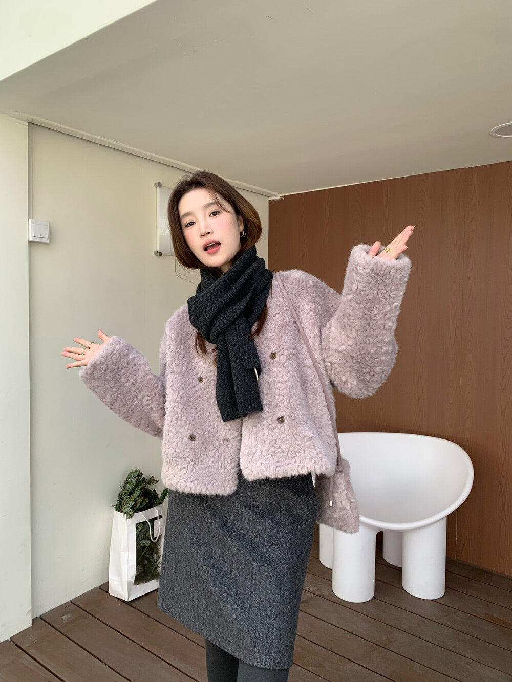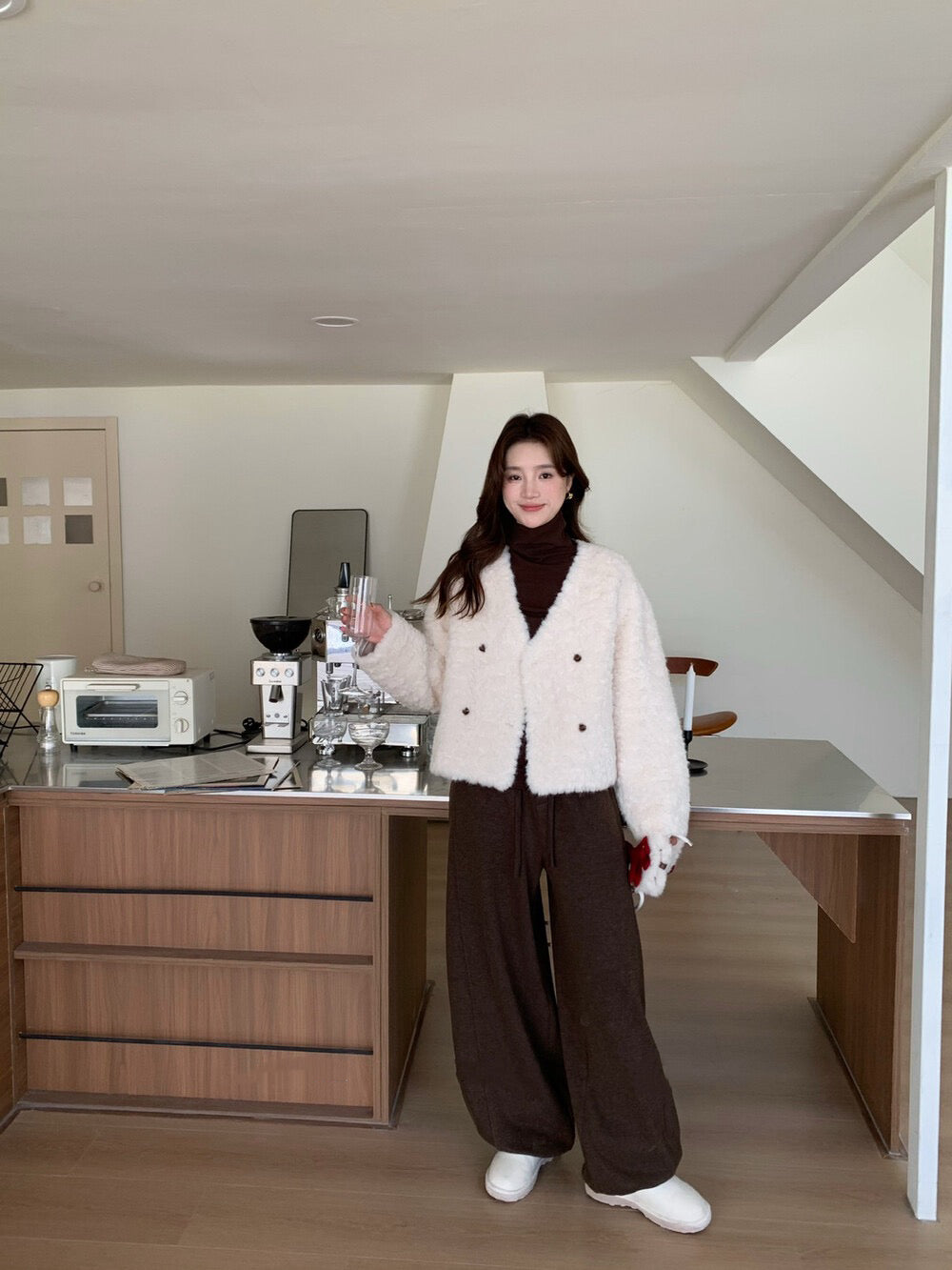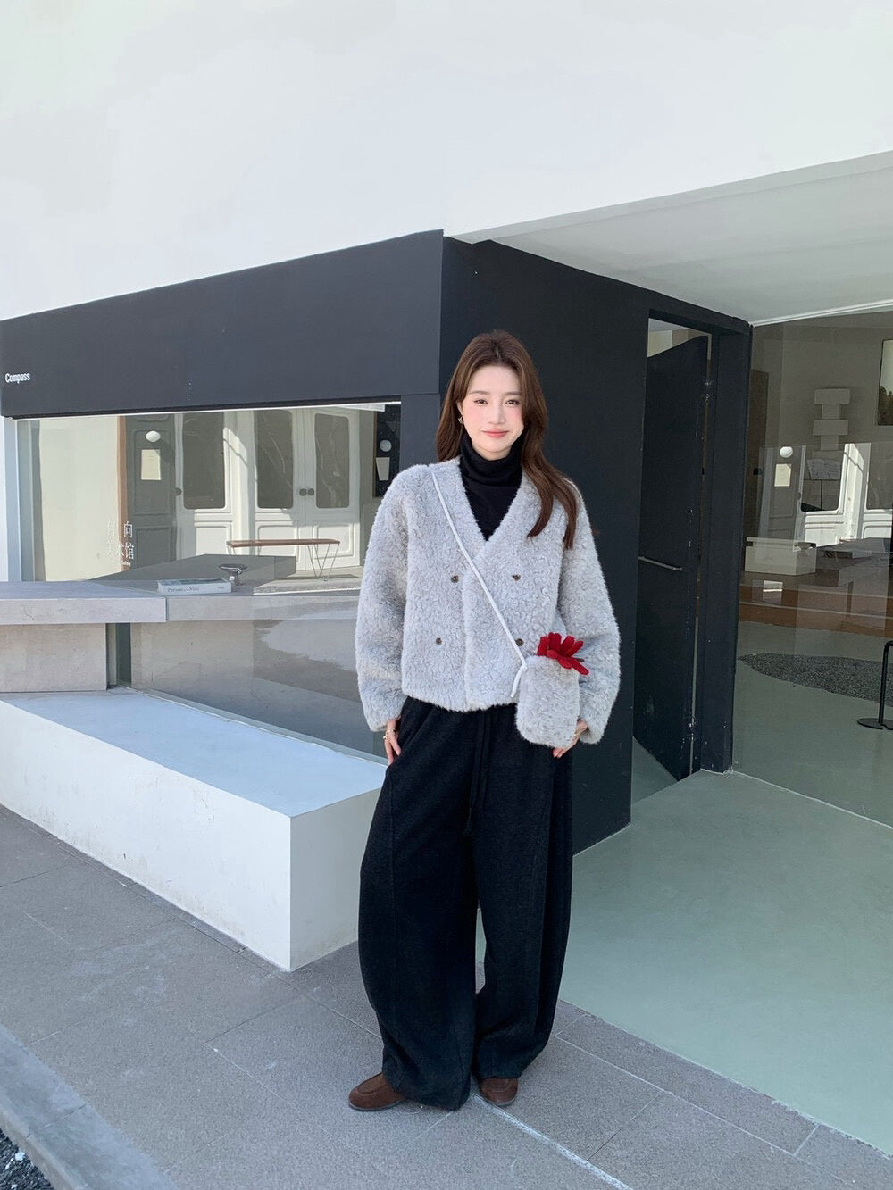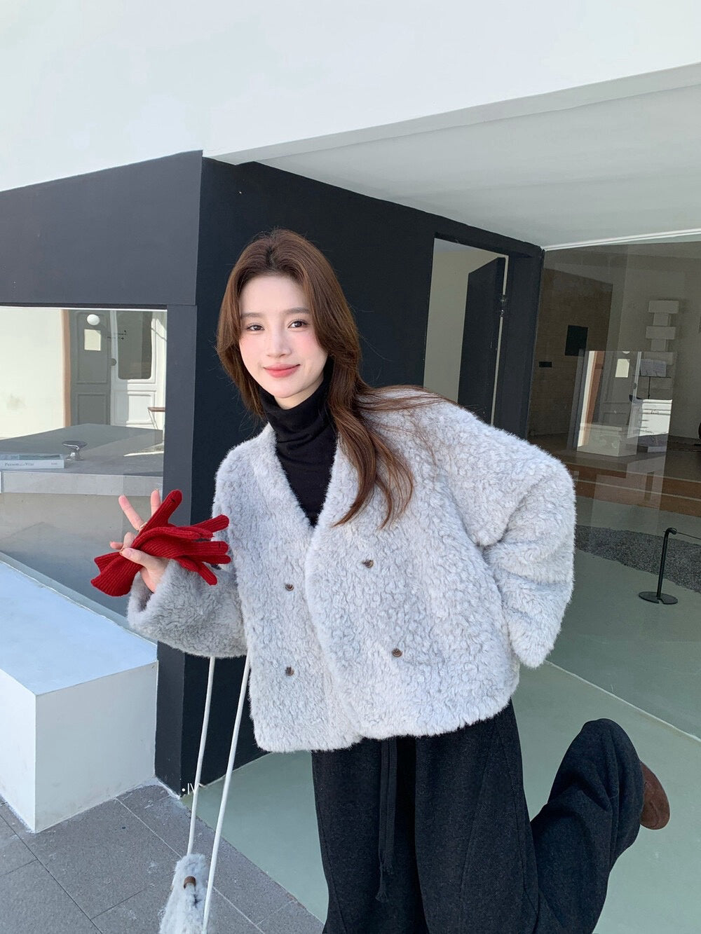 // V領雙排扣毛毛皮毛一體外套(連袋仔)
