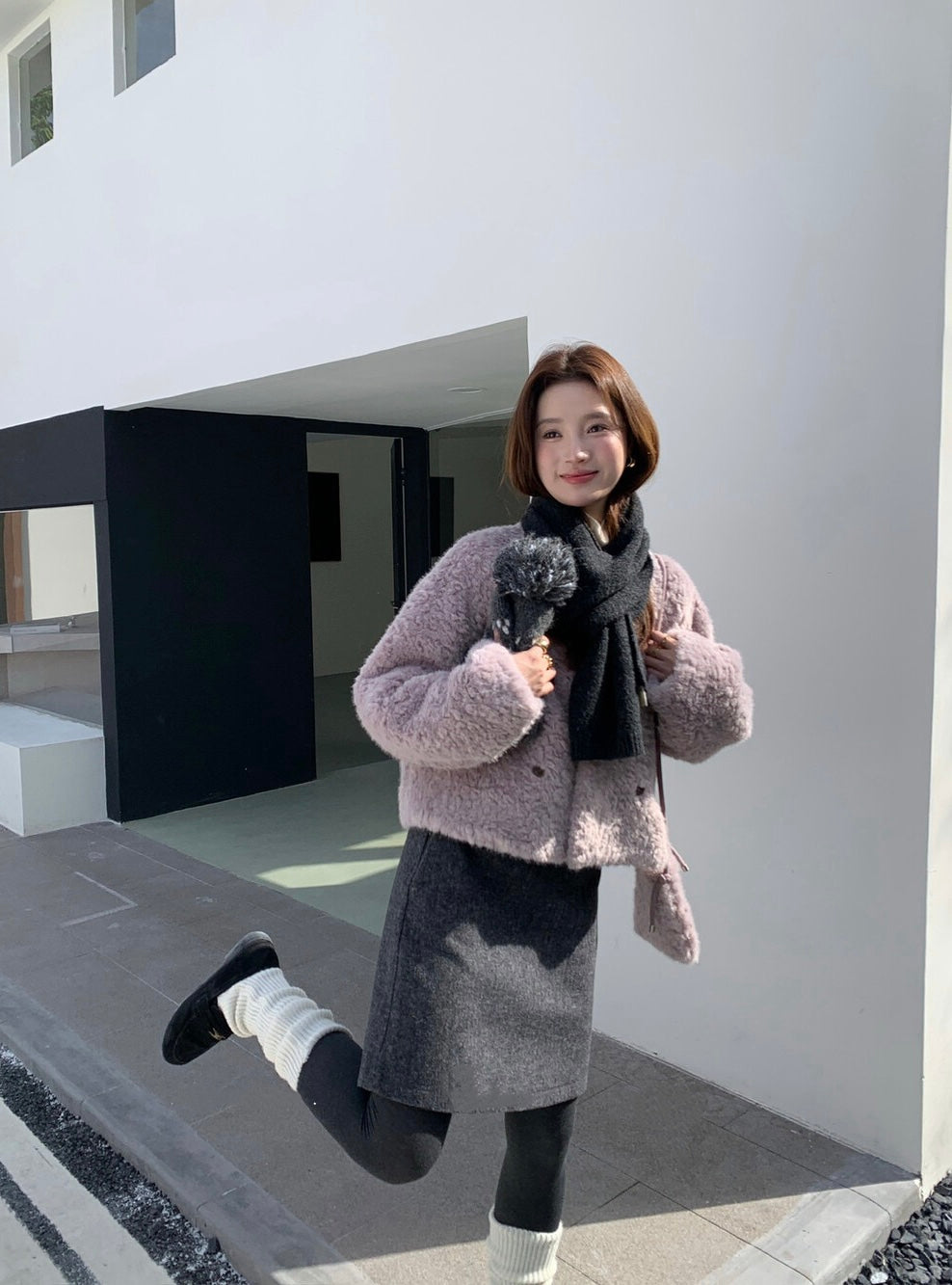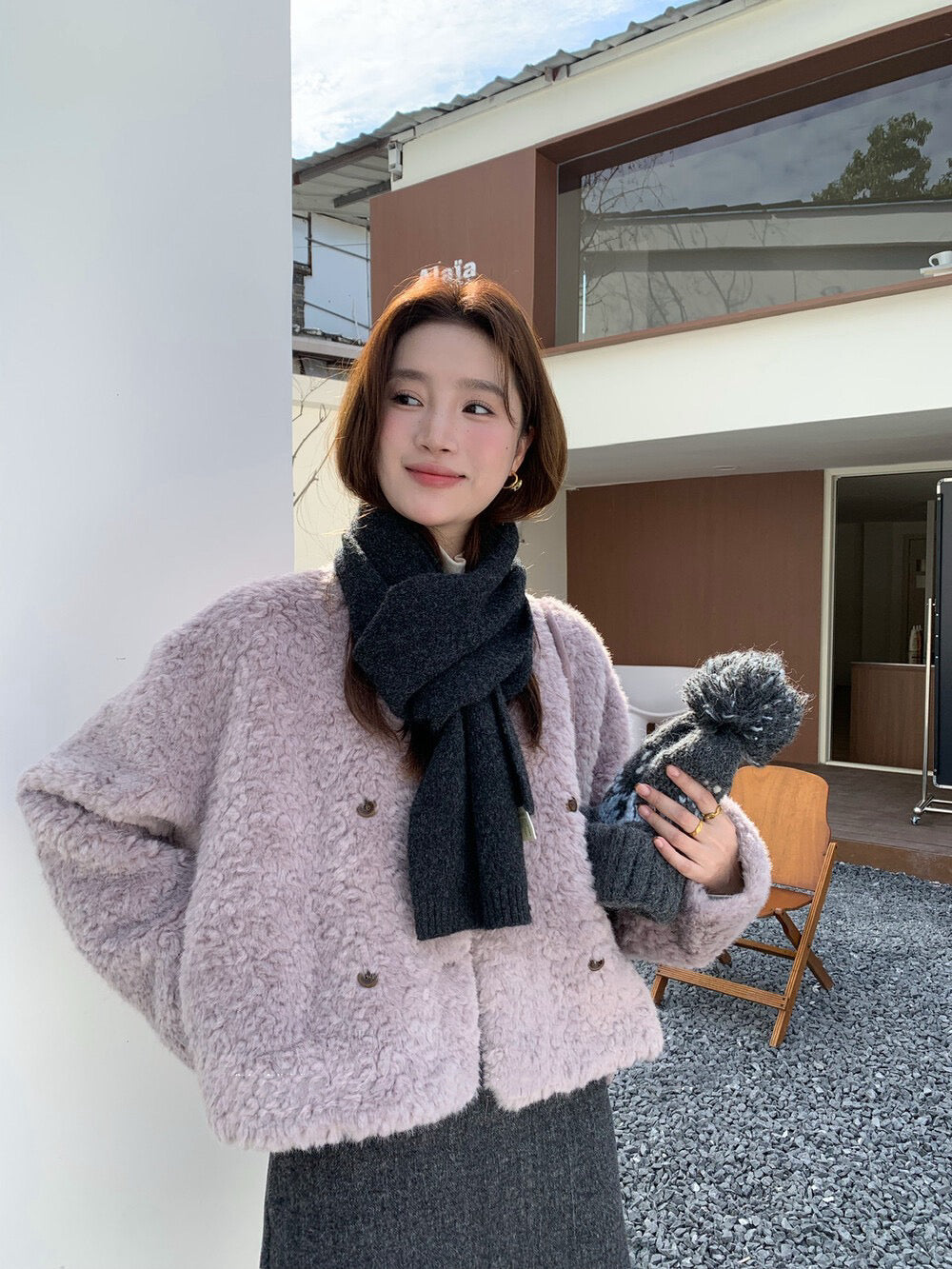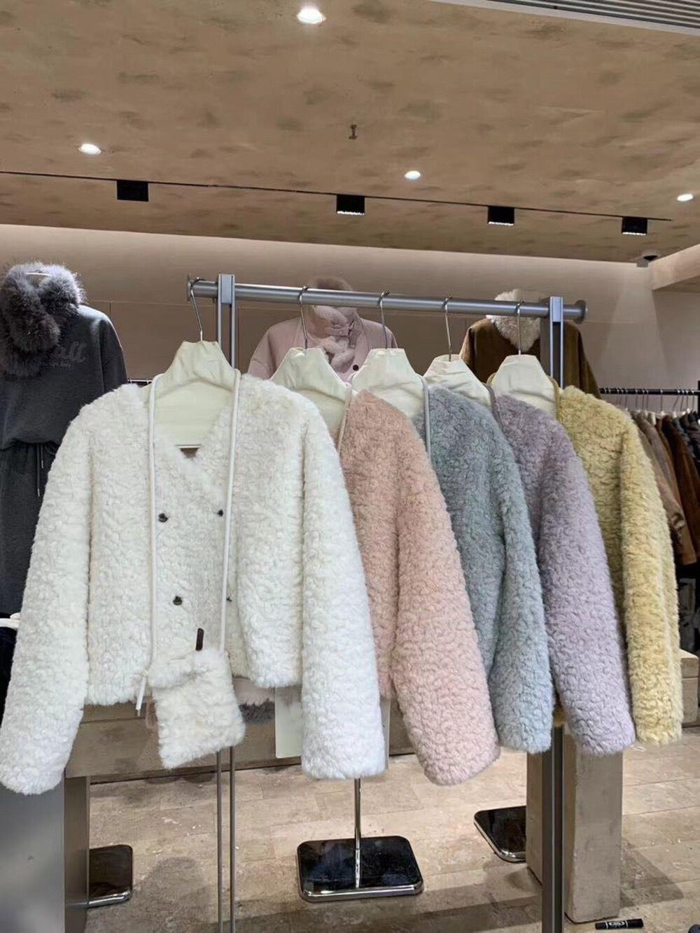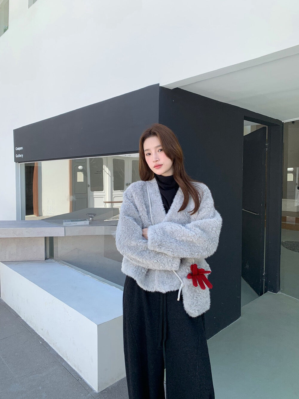// V領雙排扣毛毛皮毛一體外套(連袋仔)